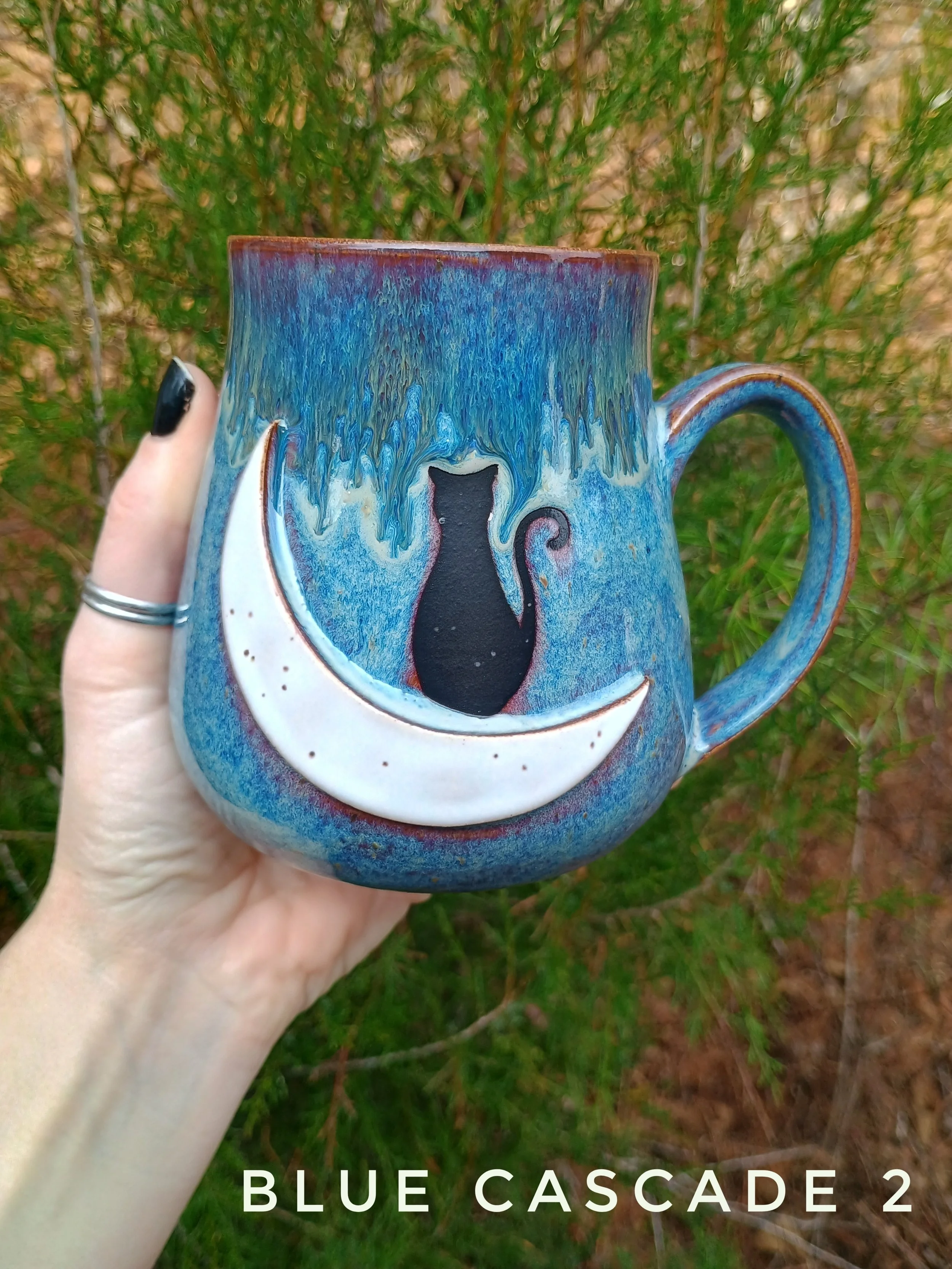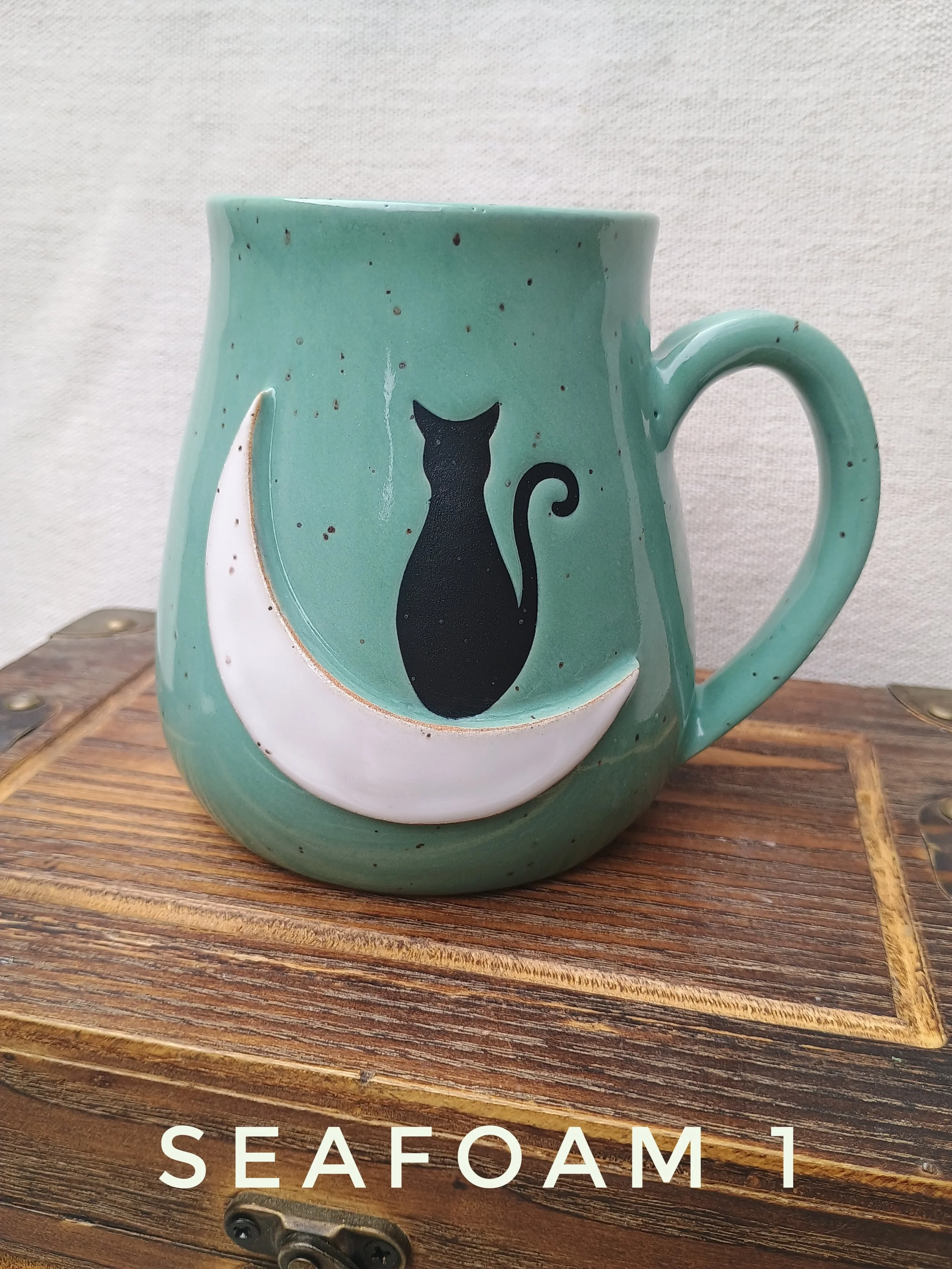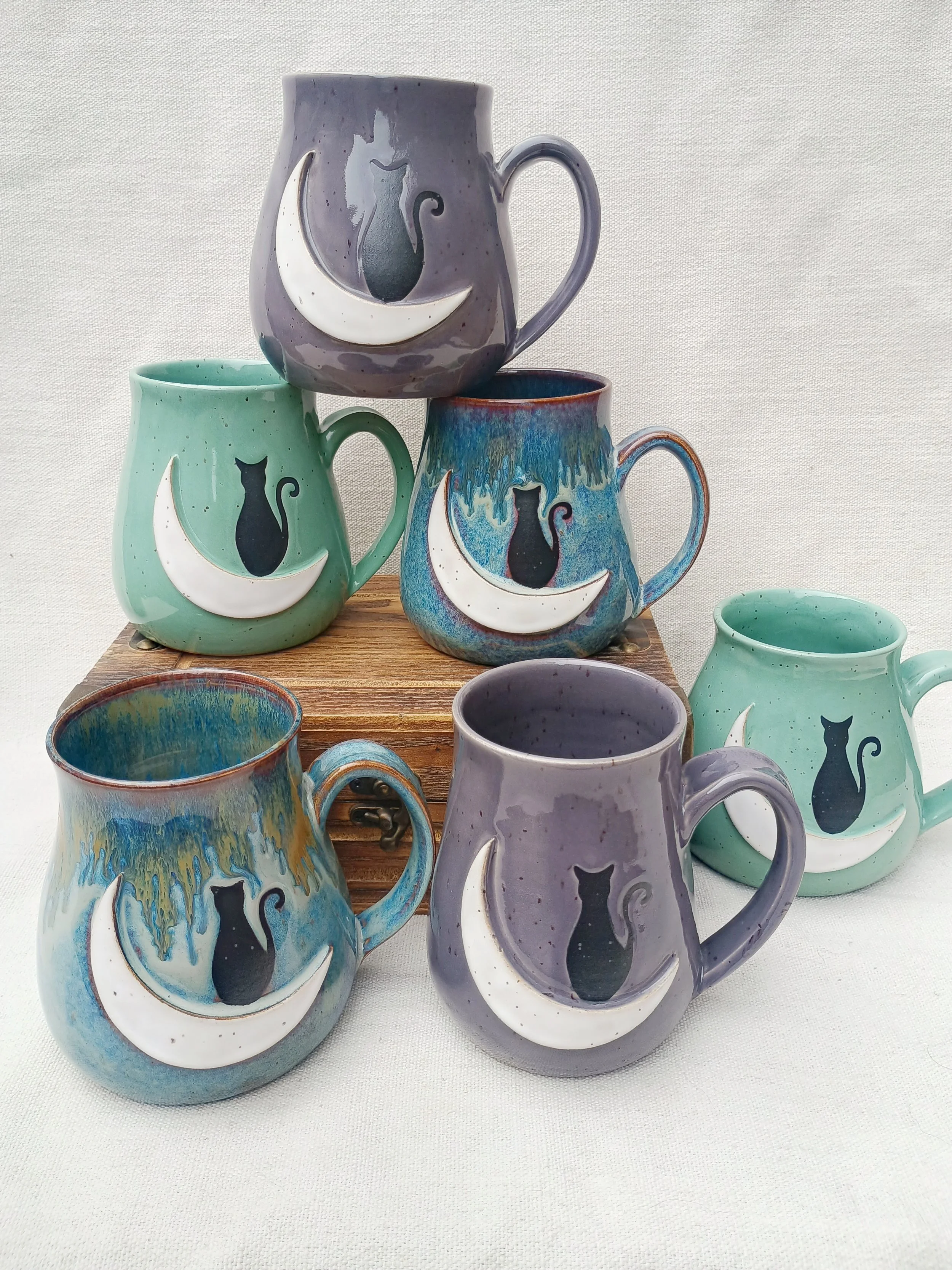 Shop › Cat & Moon Mugs Image 1 of 10 Image 2 of 10 Image 3 of 10 Image 4 of 10 Image 5 of 10 Image 6 of 10 Image 7 of 10 Image 8 of 10 Image 9 of 10 Image 10 of 10 Cat & Moon Mugs from $77.00 All mugs have a speckled crescent moon on the back! Microwave and dishwasher safe but hand washing is strongly encouraged 💕 Which mug?: Select Which mug? Seafoam 1 Seafoam 2 Purple-Grey 1 Purple-Grey 2 Blue Cascade 1 Blue Cascade 2 Quantity: Add To Cart Added! All mugs have a speckled crescent moon on the back! Microwave and dishwasher safe but hand washing is strongly encouraged 💕 ADD ON Glitter Ring Dish $14.00 Add To Cart