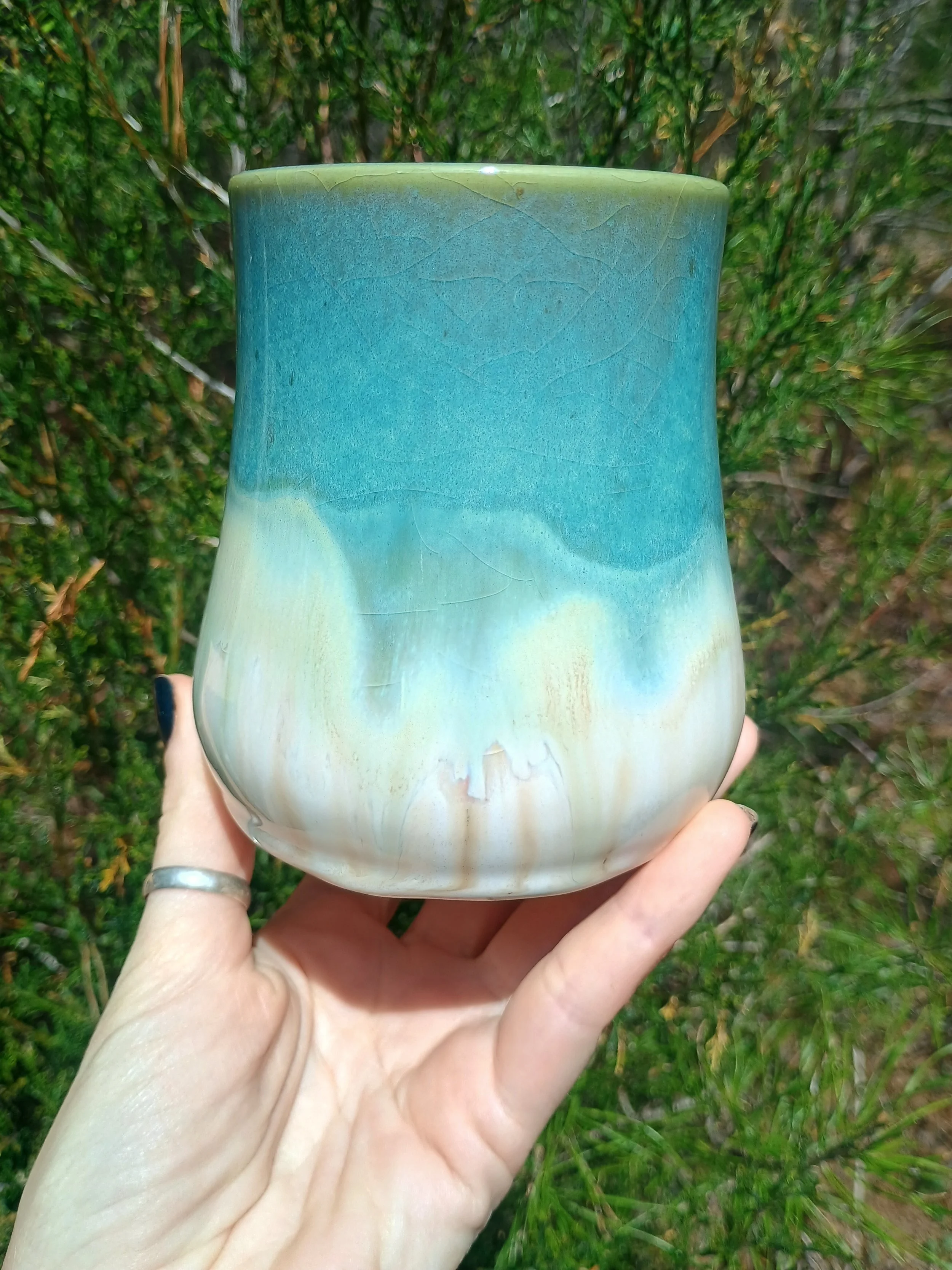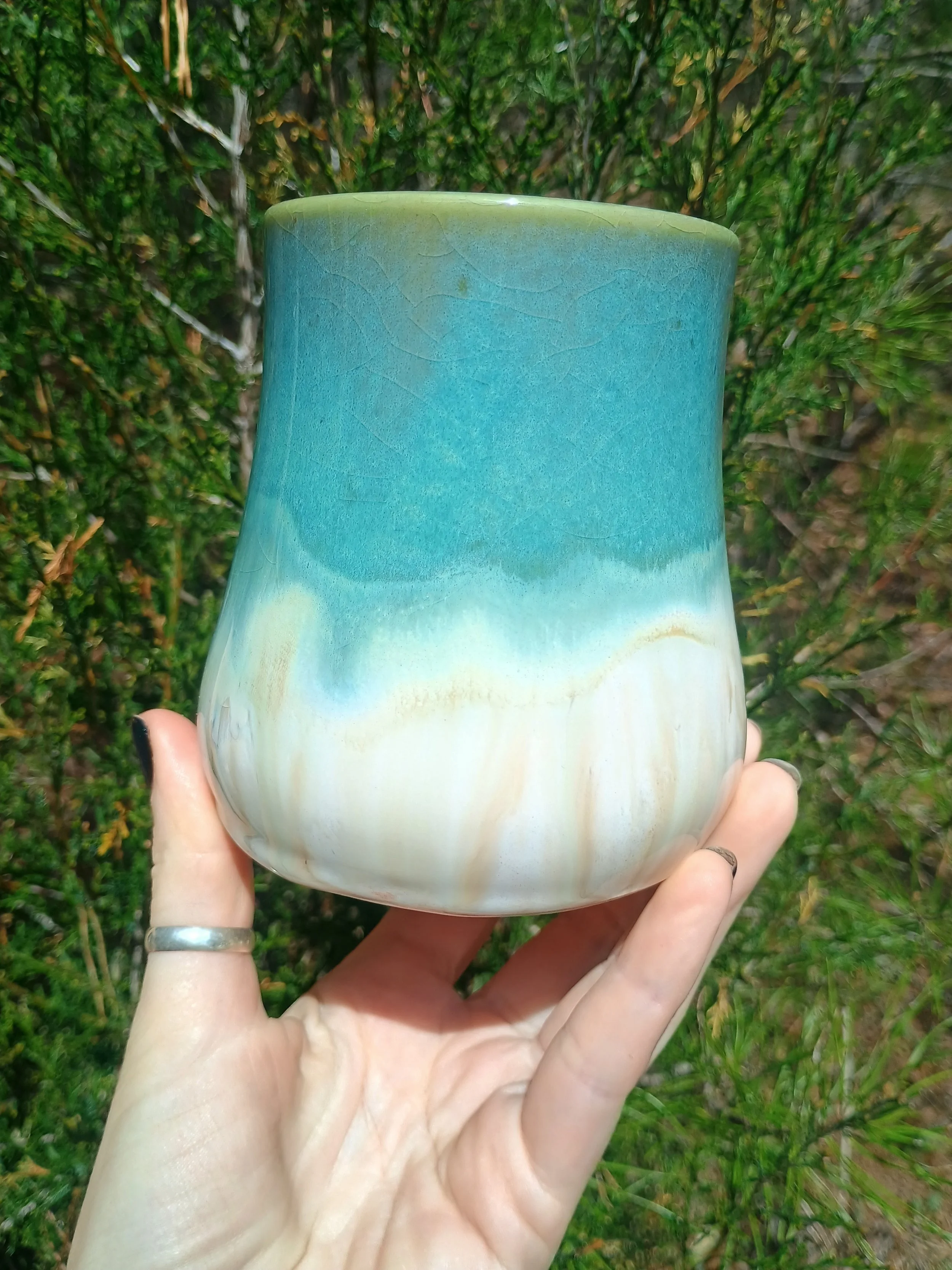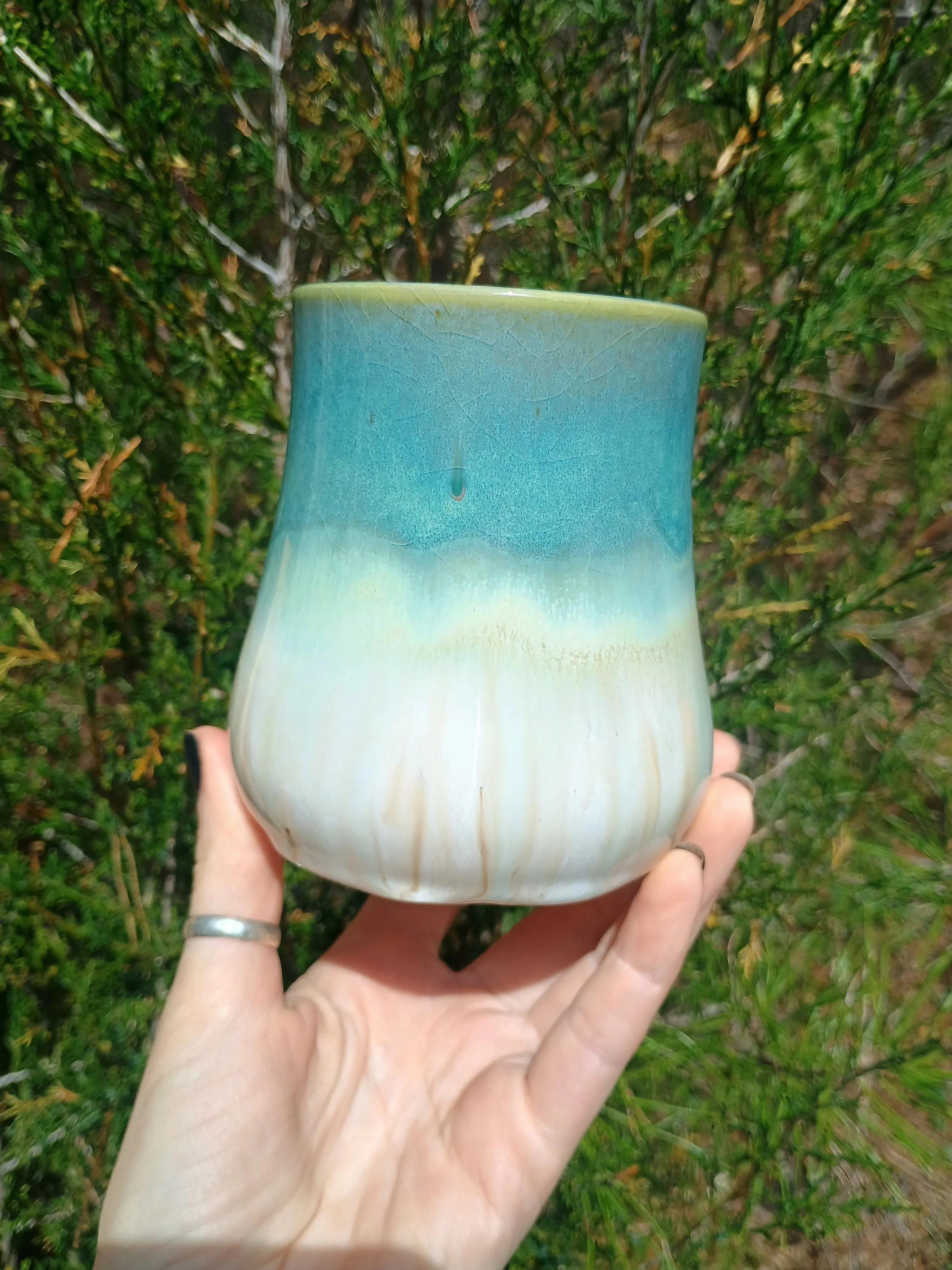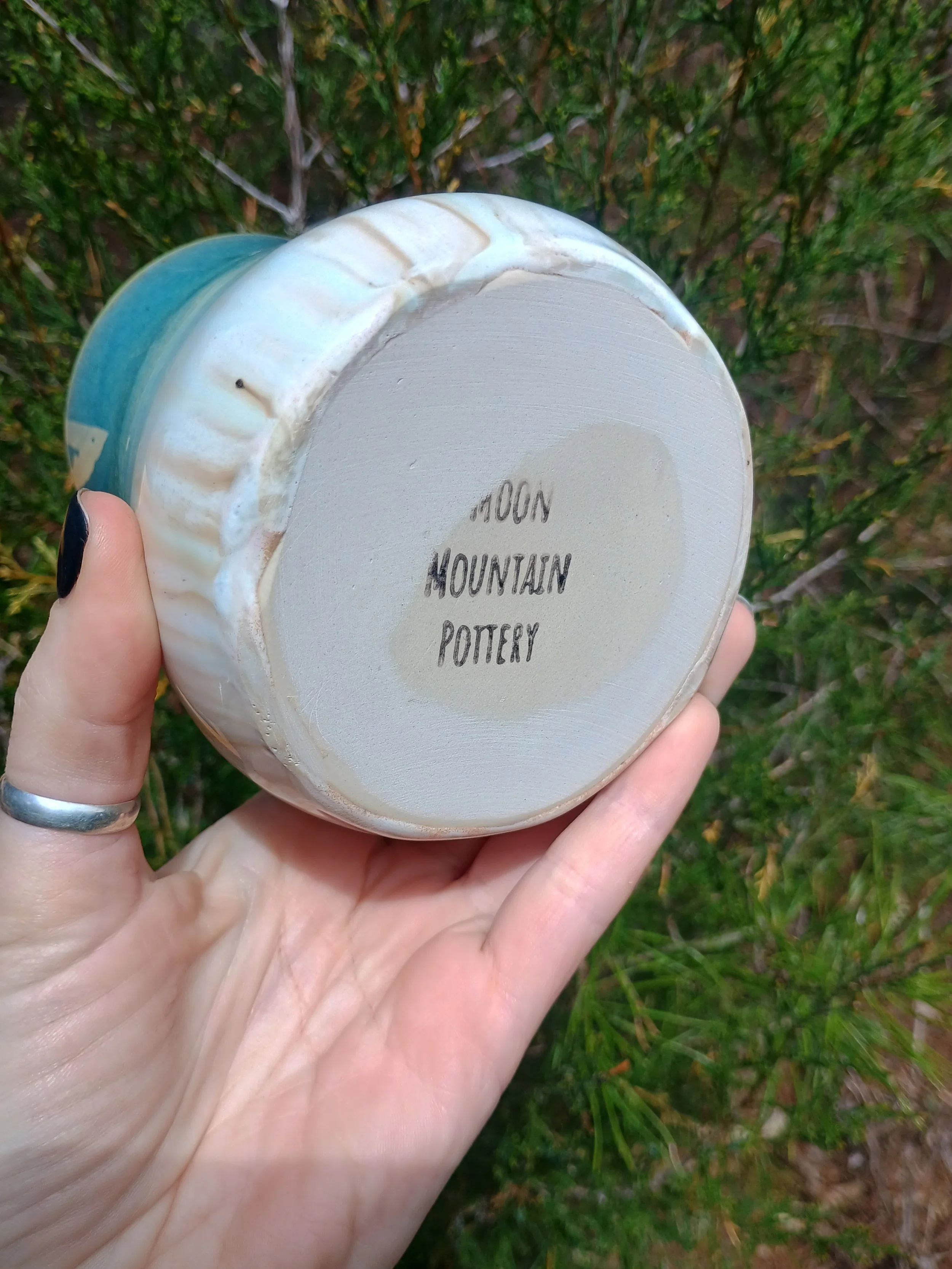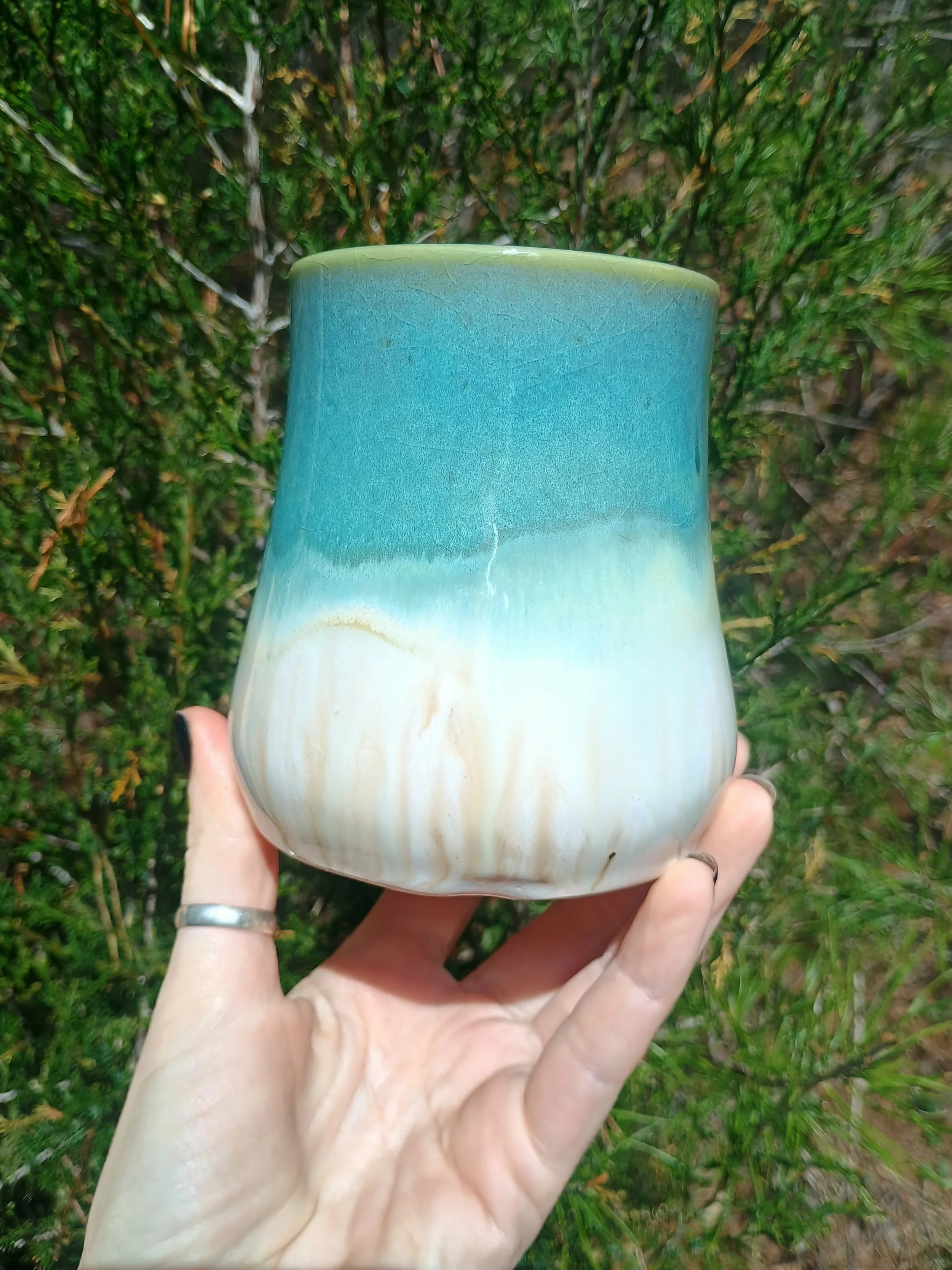 This small tumbler has been discounted because I had to grind several glaze drops from the bottom. Microwave and dishwasher safe but hand washing is strongly encouraged 💕