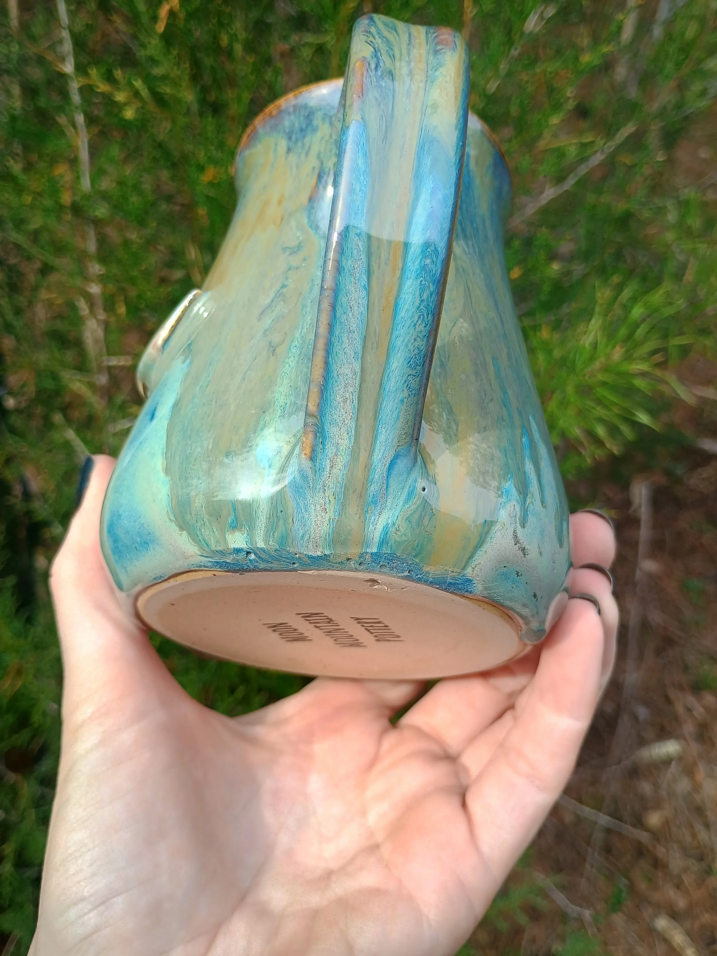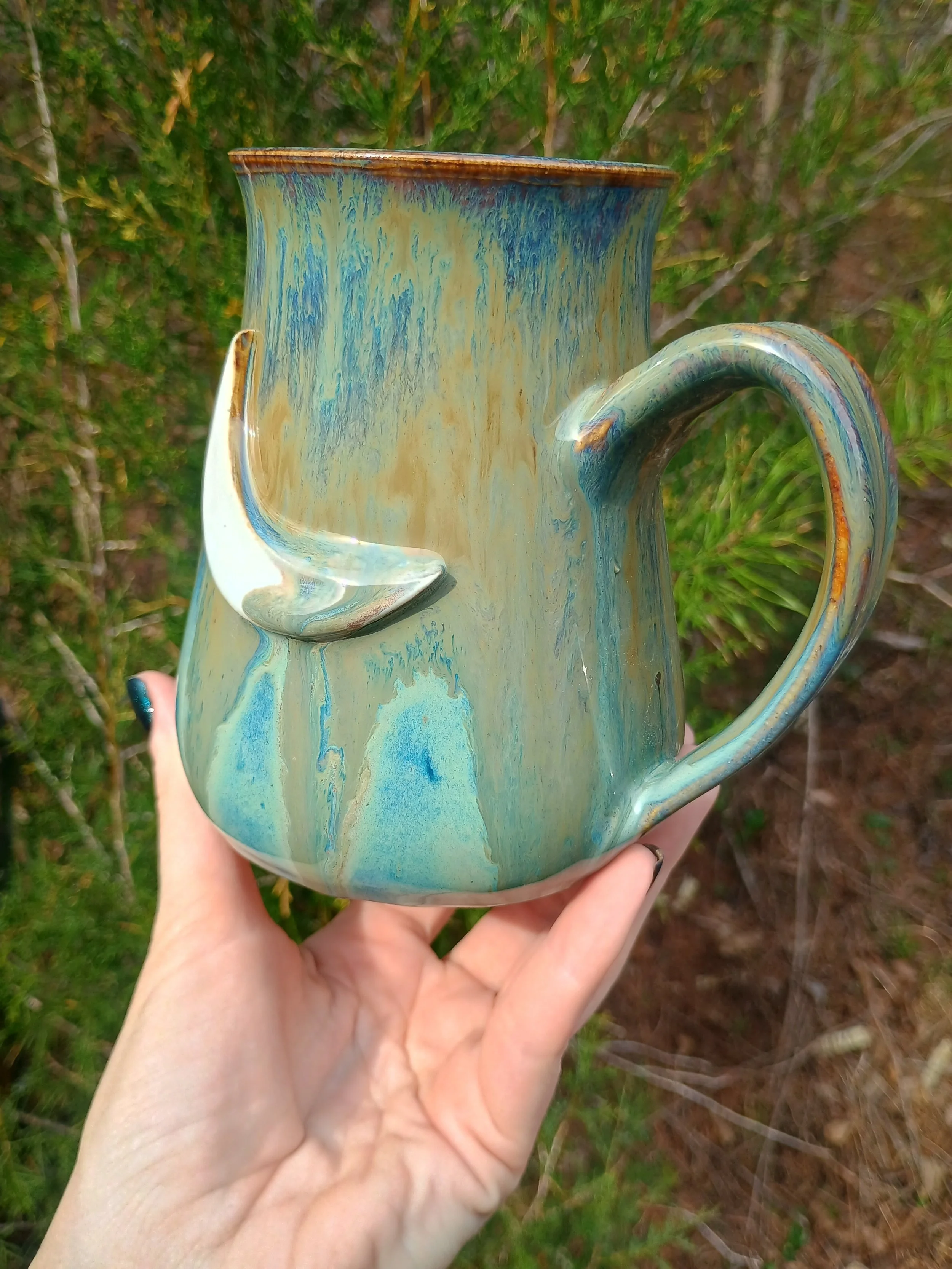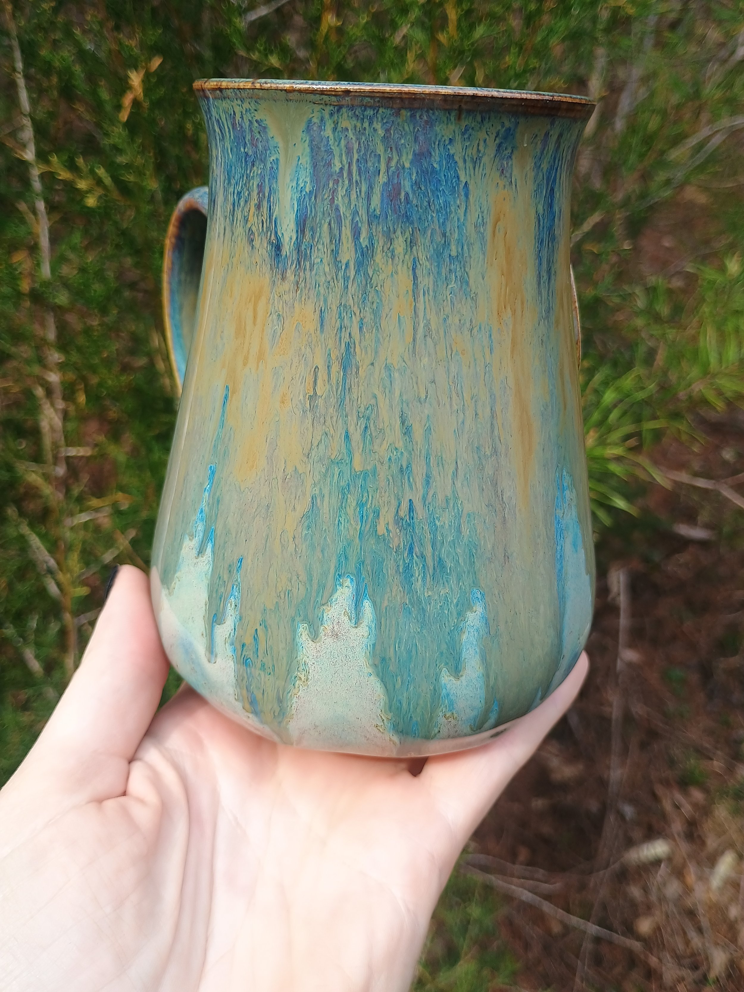 This large mug has been discounted due to the glaze dripping below the handle and needing to be ground down (see last 2 pics). I also don't personally love how the glaze turned out, so I would just like to find any loving home for this piece. Microwave and dishwasher safe but hand washing is strongly encouraged 💕