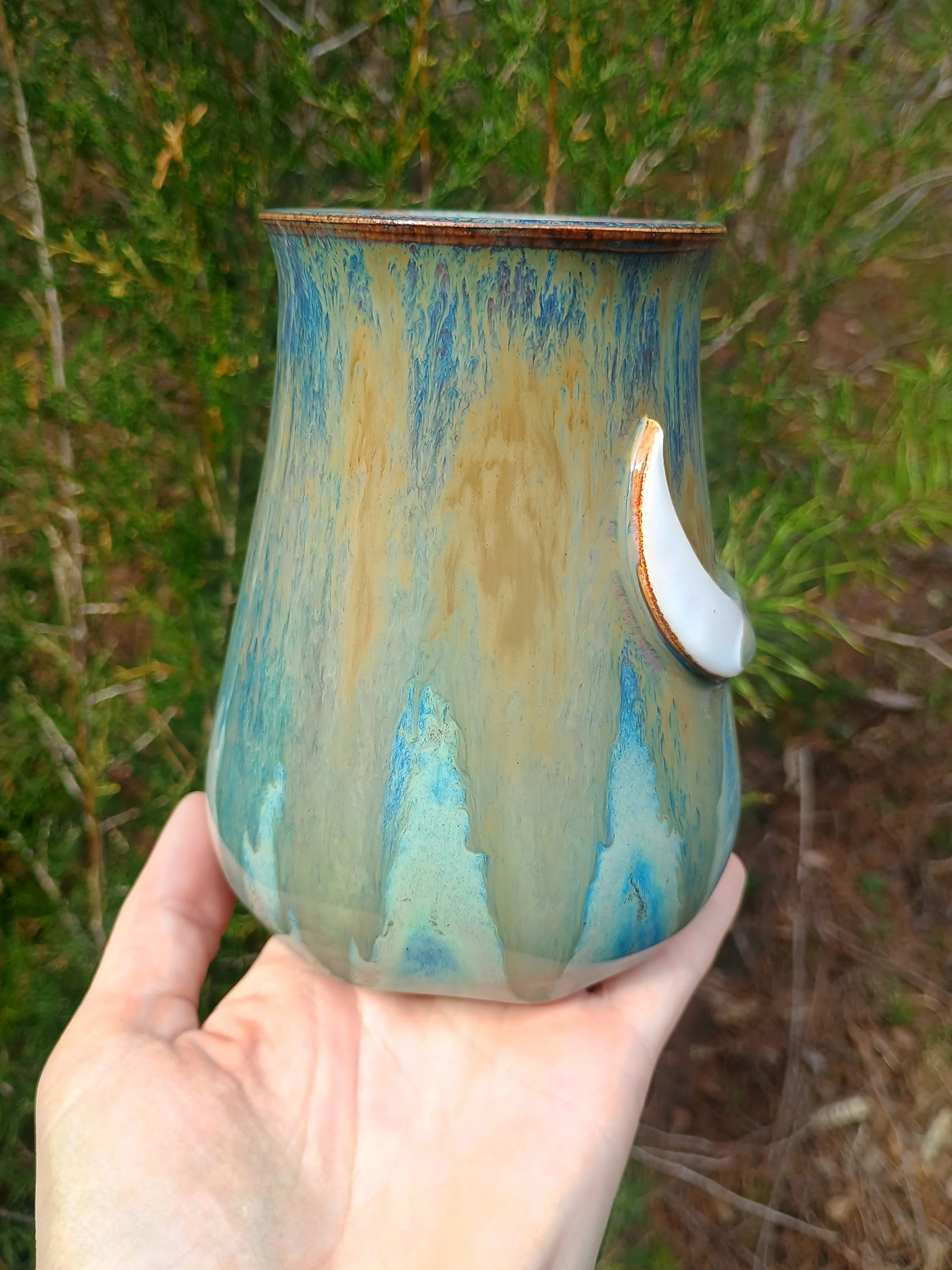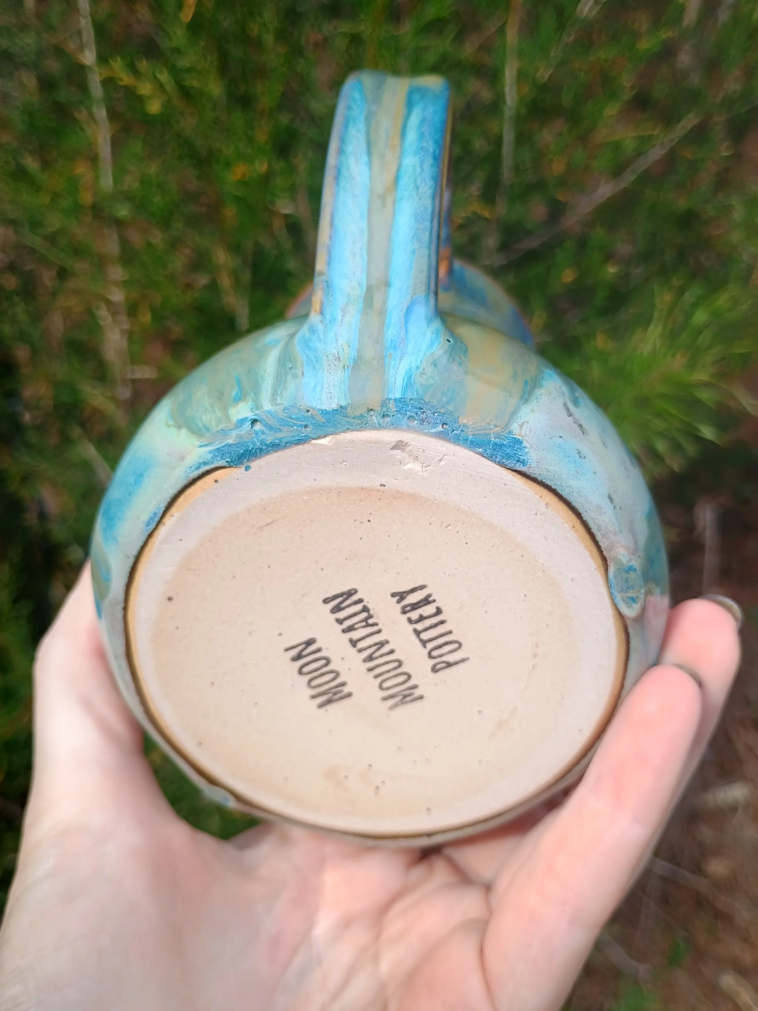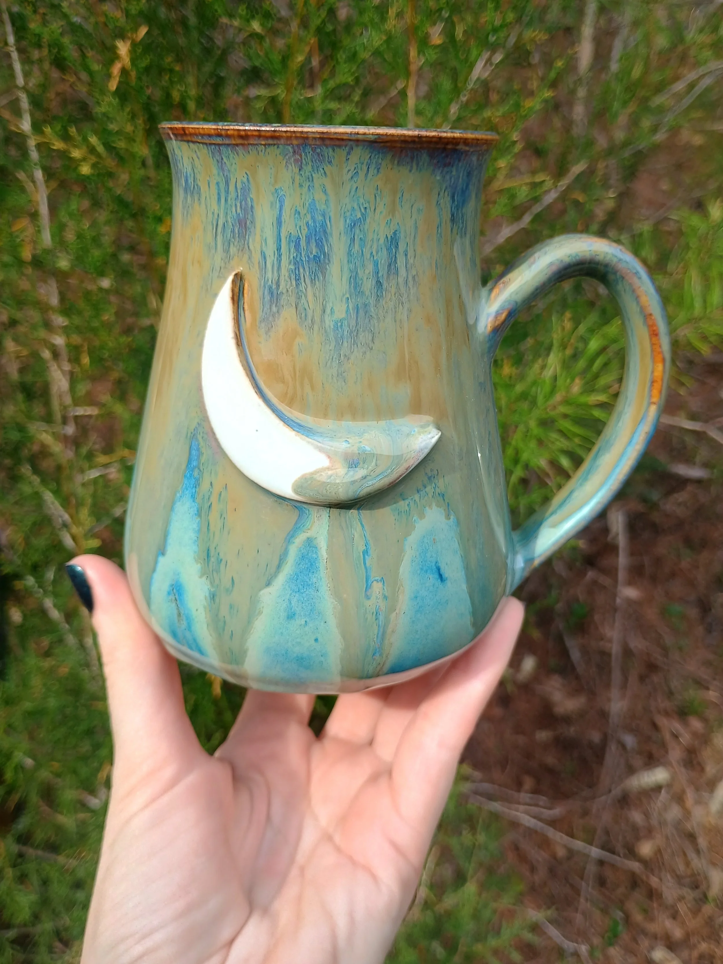 This large mug has been discounted due to the glaze dripping below the handle and needing to be ground down (see last 2 pics). I also don't personally love how the glaze turned out, so I would just like to find any loving home for this piece. Microwave and dishwasher safe but hand washing is strongly encouraged 💕
