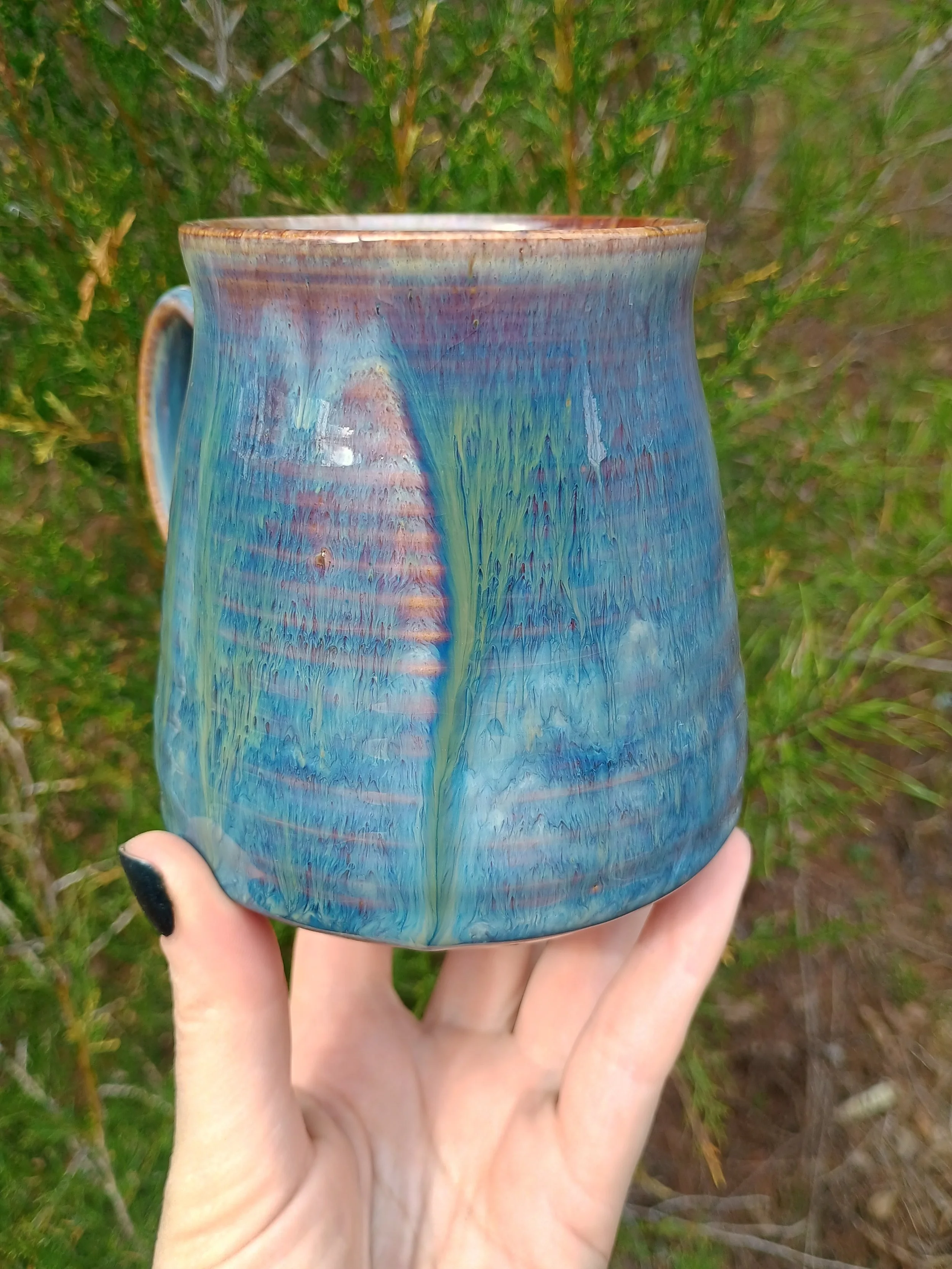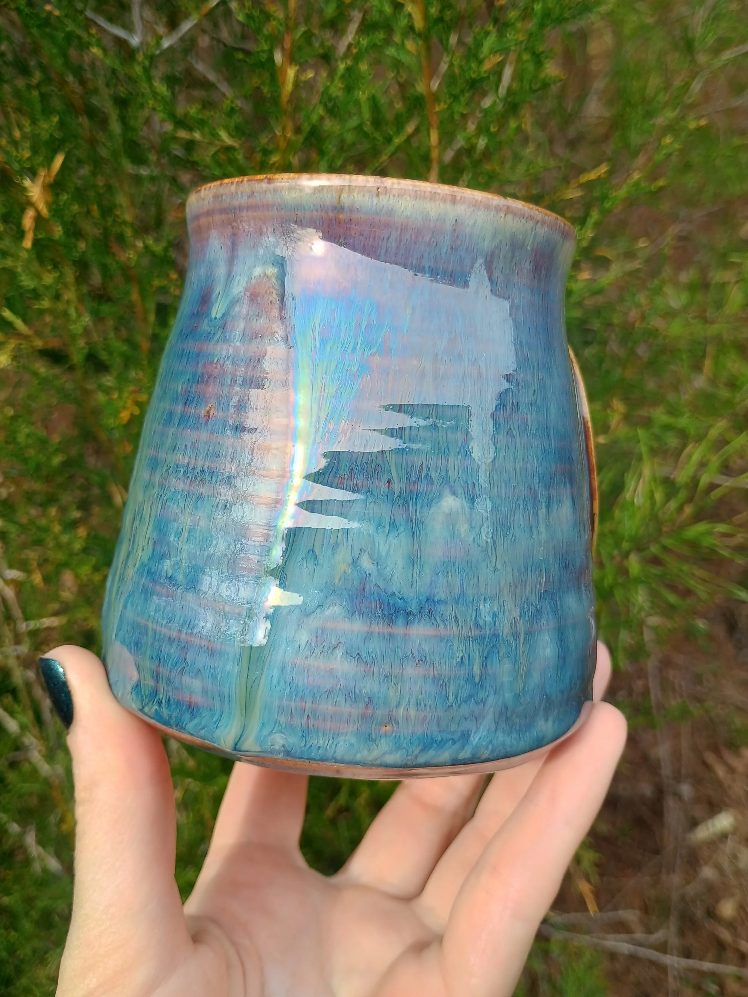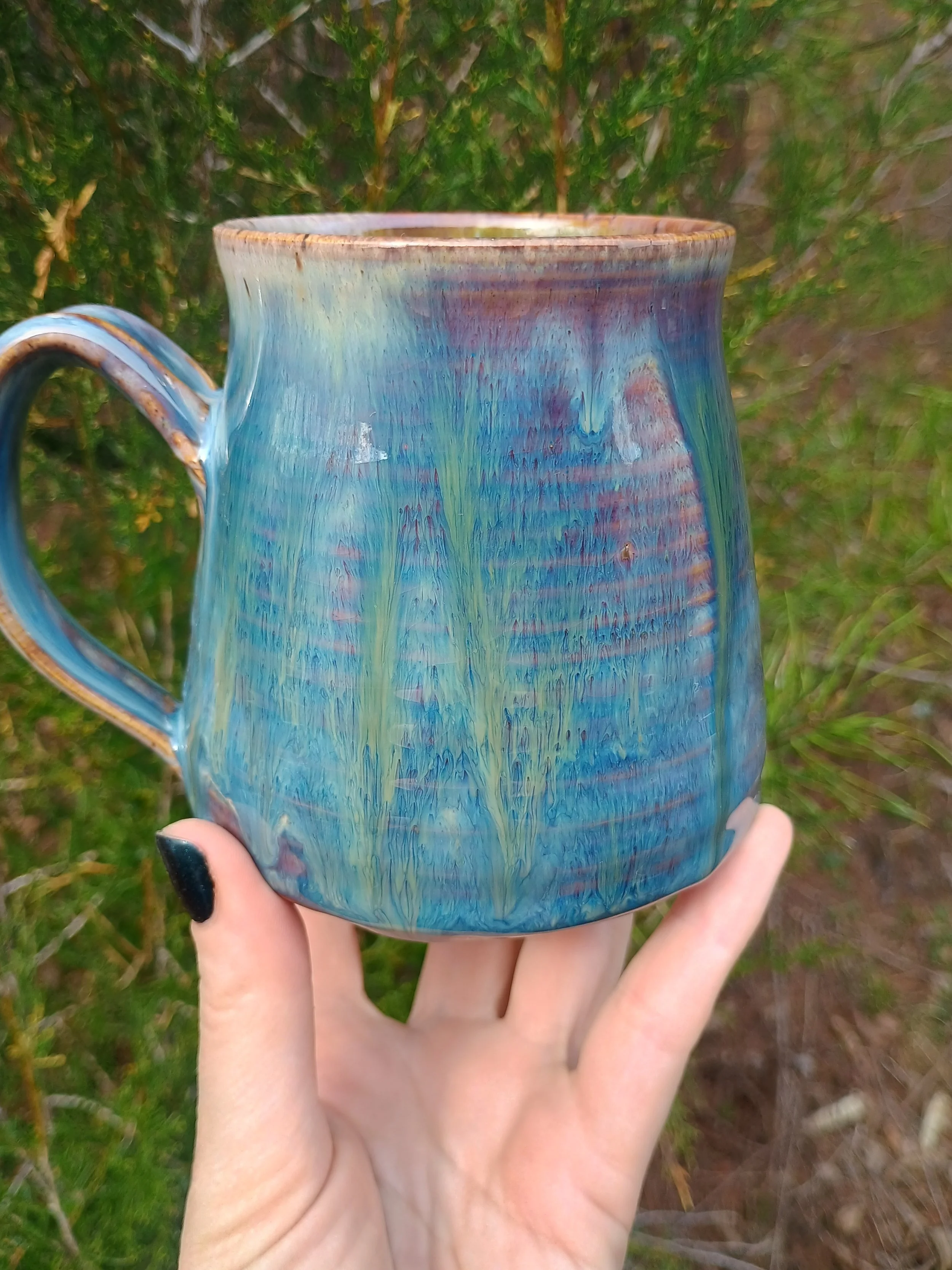 This mug had to be fired twice which resulted in extra gorgeous drippiness from the glaze. There are all different shades of purple, blue, and green, as well as some iridescence in the green streak on the back. Microwave and dishwasher safe but hand washing is strongly encouraged 💕