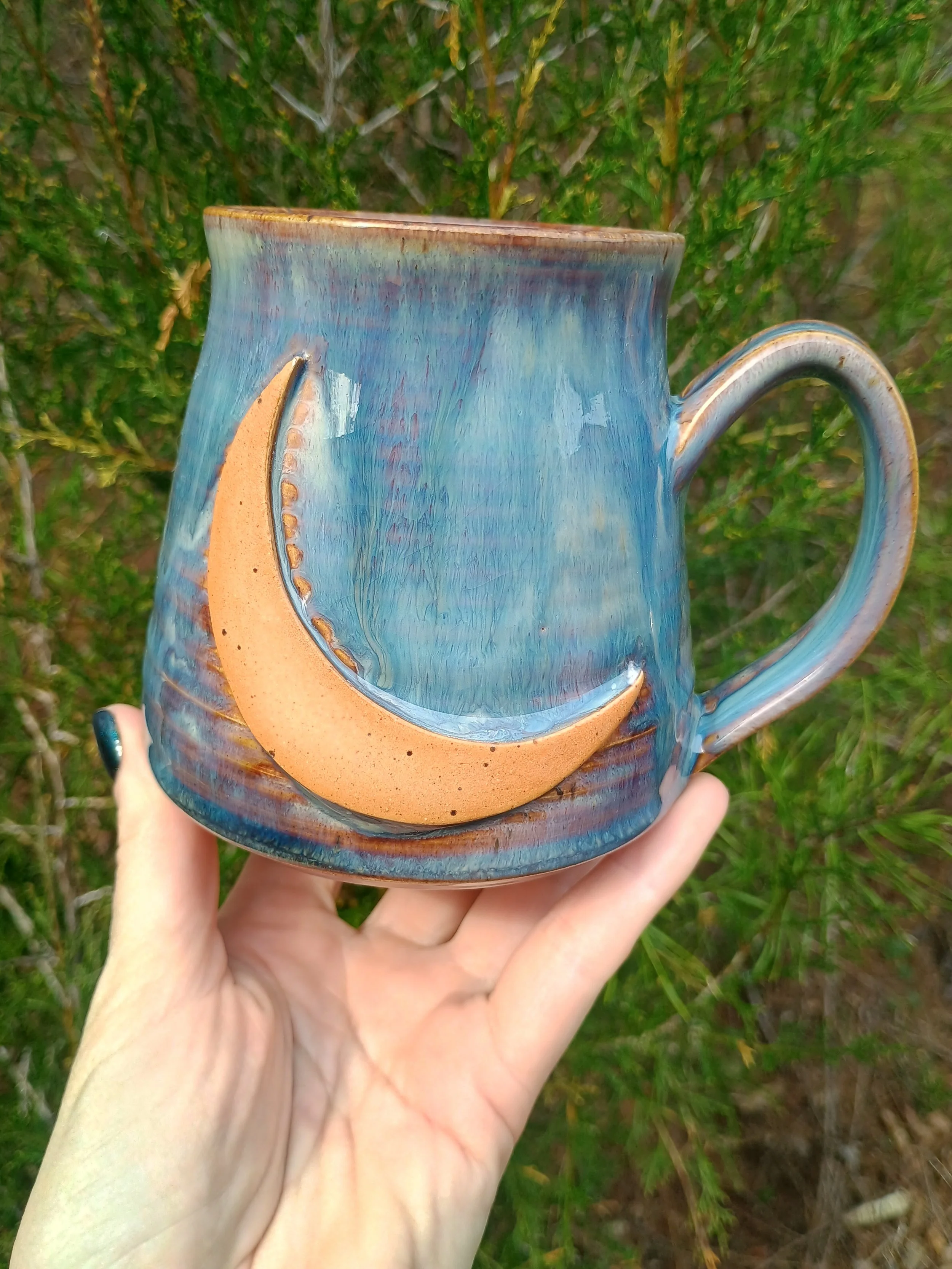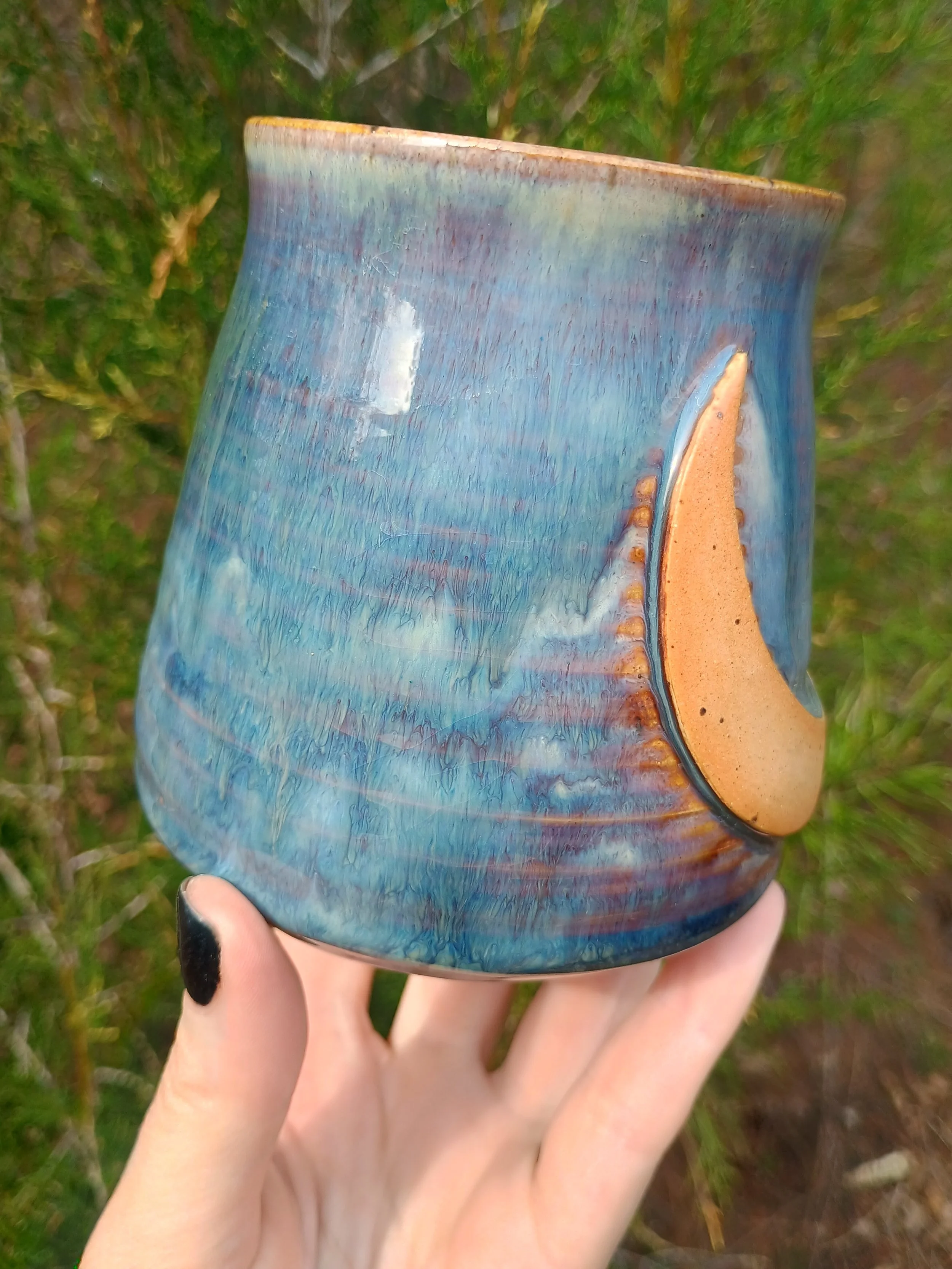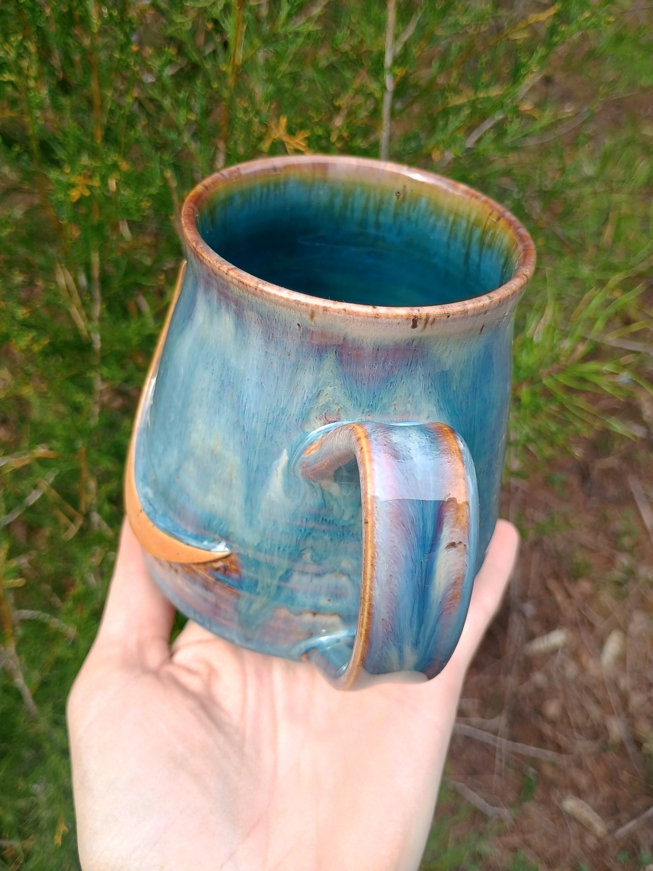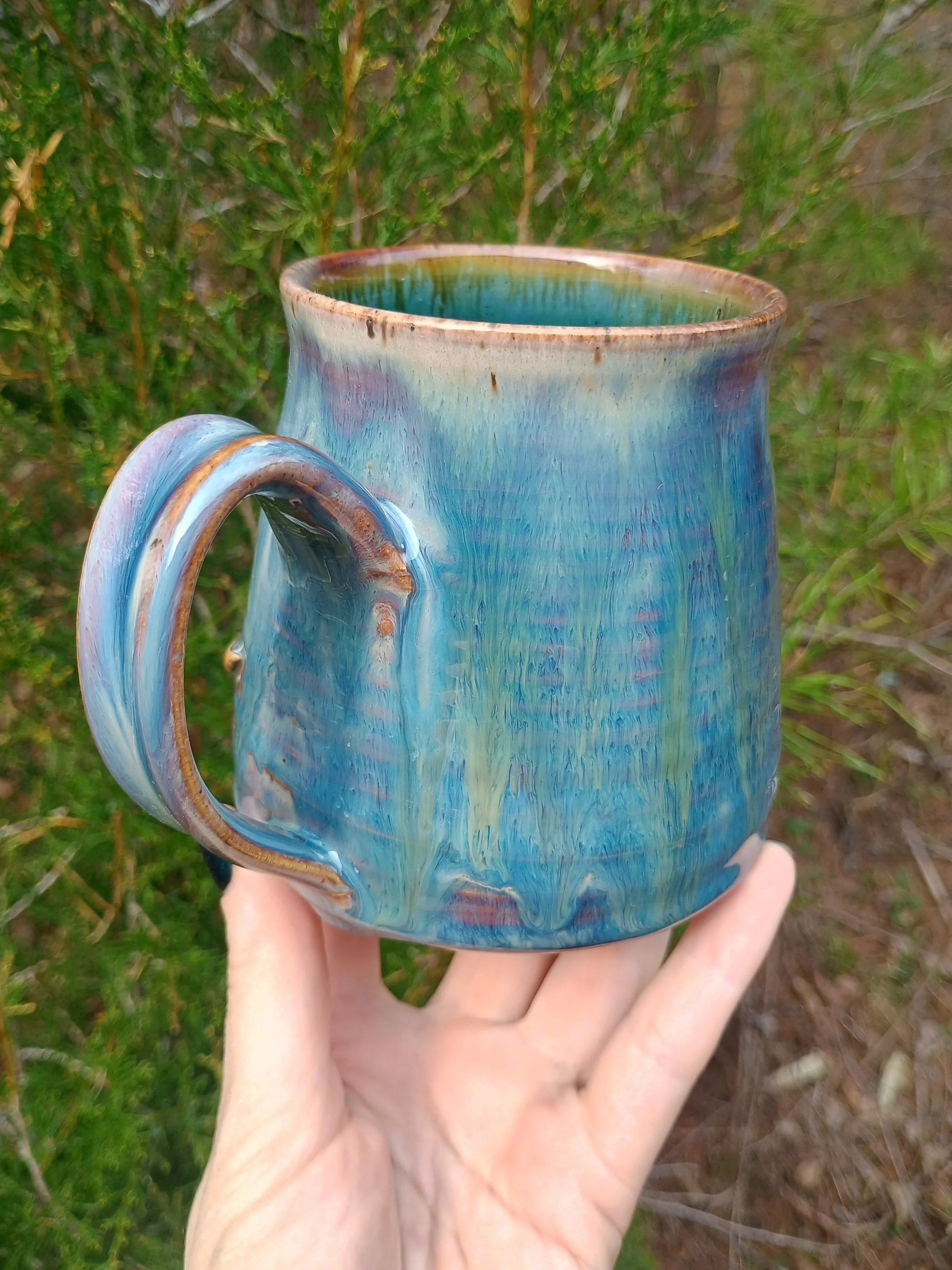 This mug had to be fired twice which resulted in extra gorgeous drippiness from the glaze. There are all different shades of purple, blue, and green, as well as some iridescence in the green streak on the back. Microwave and dishwasher safe but hand washing is strongly encouraged 💕