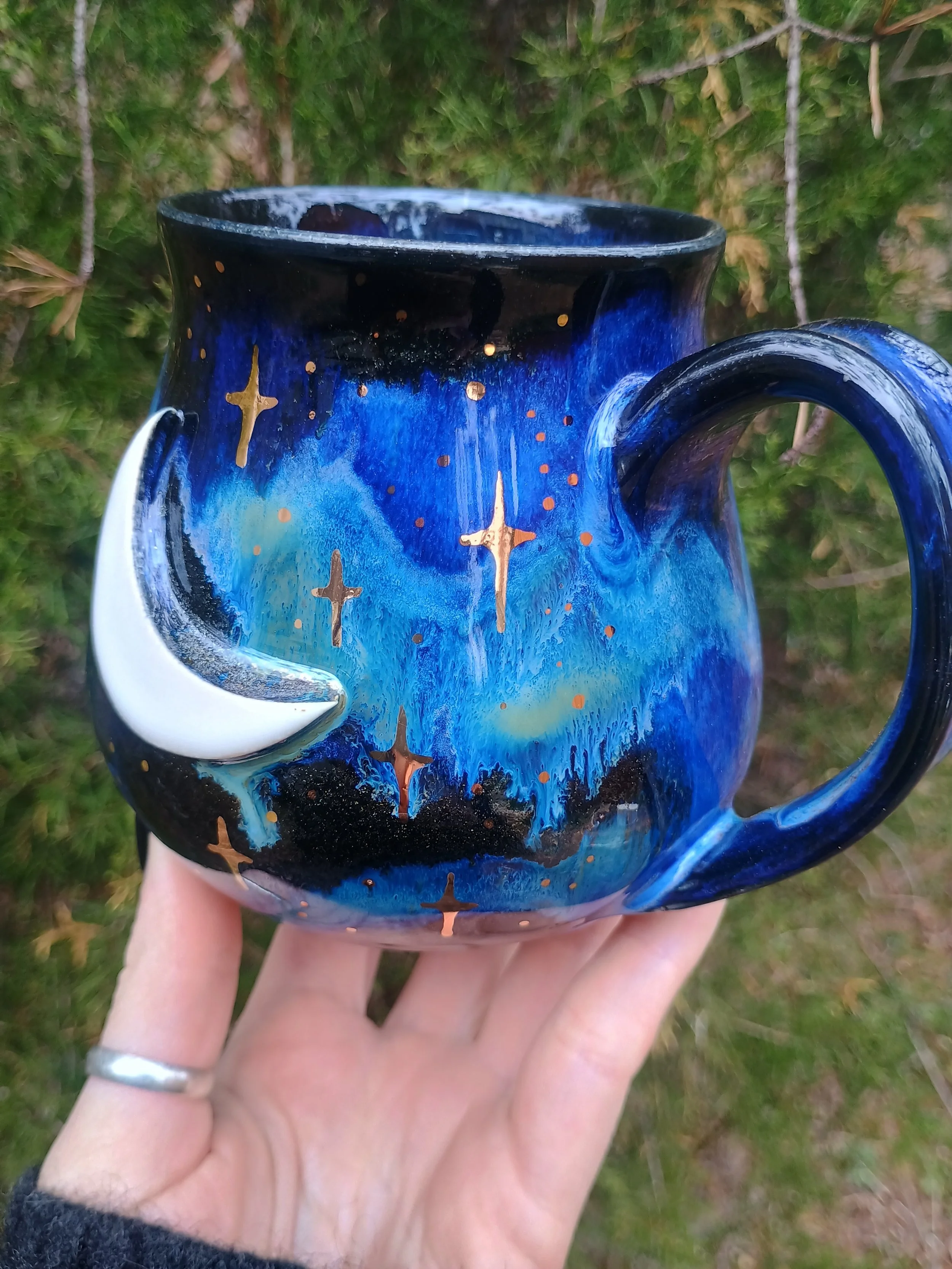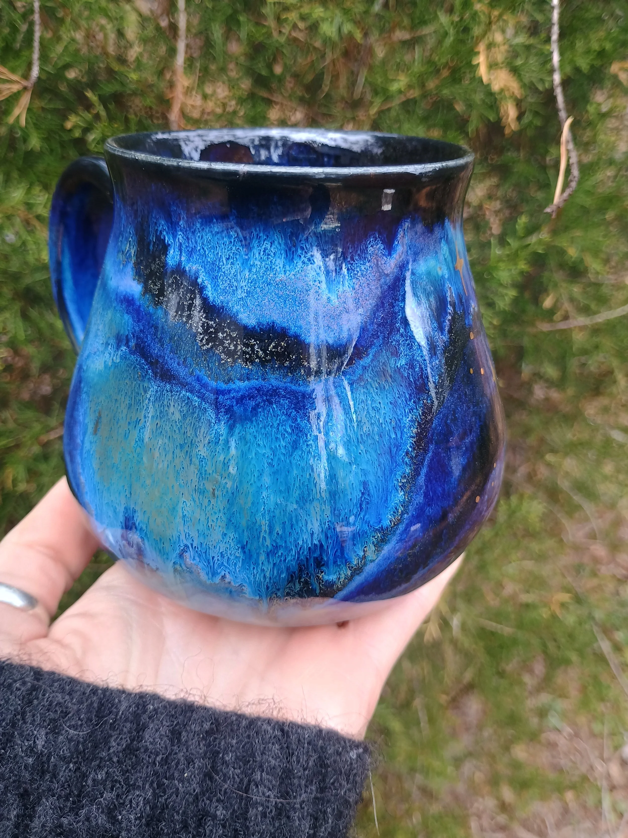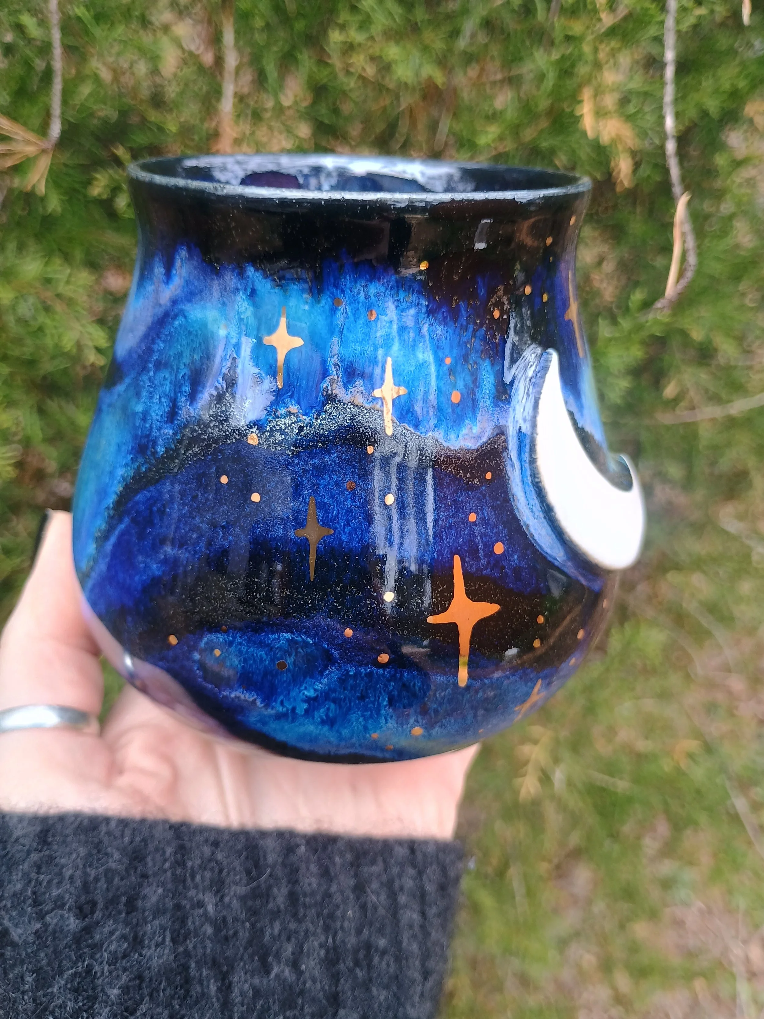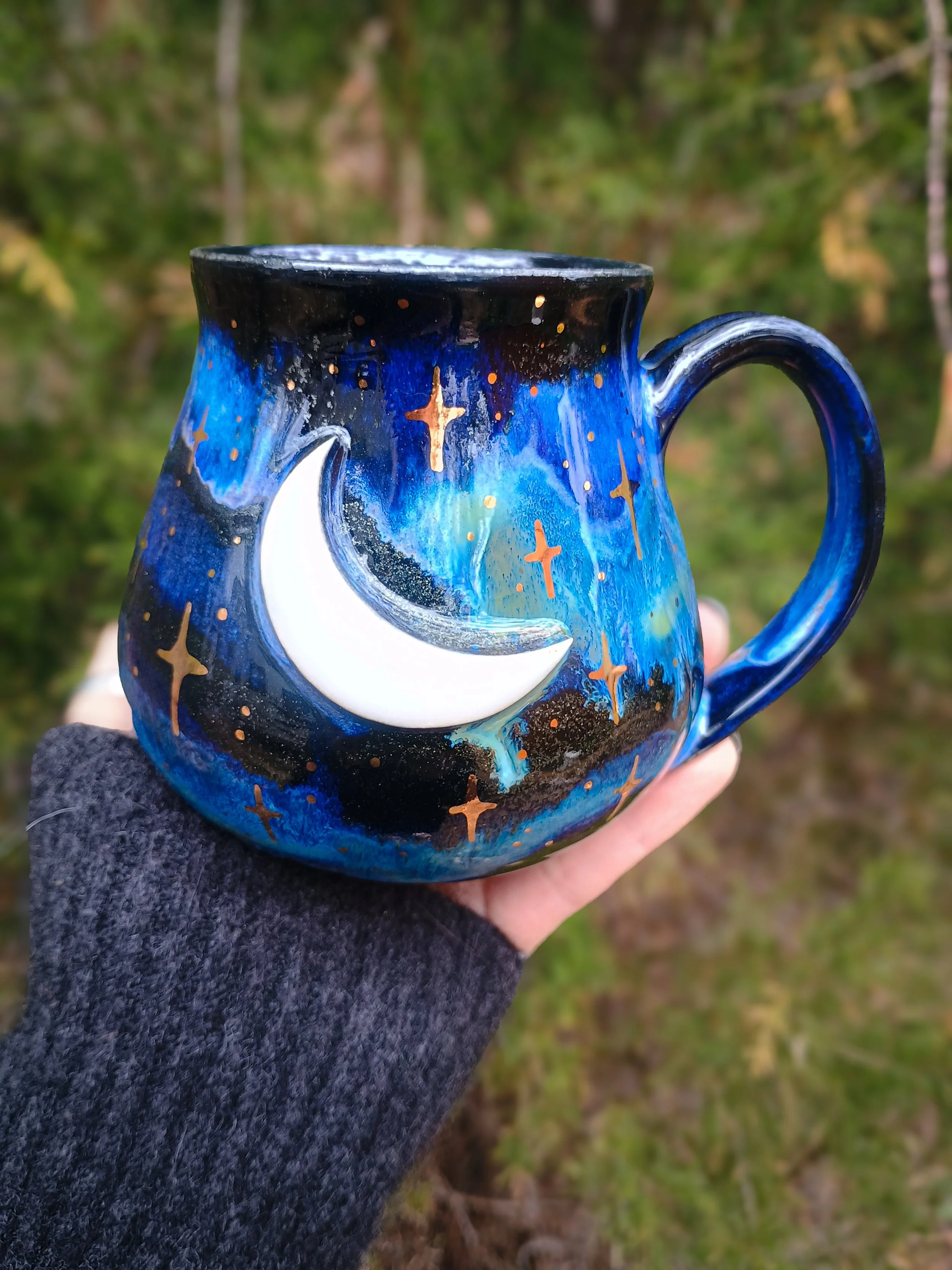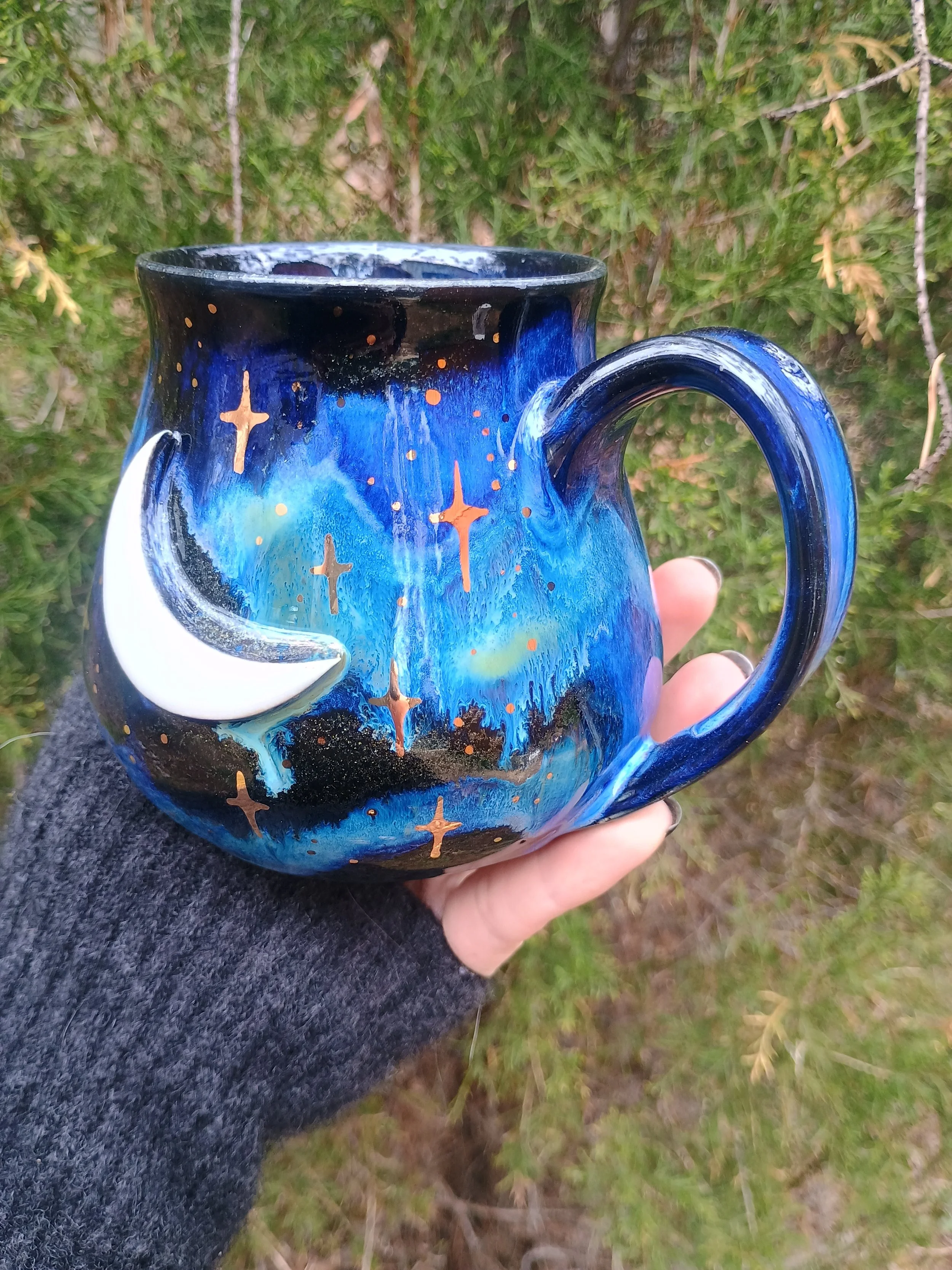 Shop › Gold Stars Mug in Night Sky Glaze Image 1 of 7 Image 2 of 7 Image 3 of 7 Image 4 of 7 Image 5 of 7 Image 6 of 7 Image 7 of 7 Gold Stars Mug in Night Sky Glaze $111.00 sold out This special mug is not microwave or dishwasher safe due to the real gold luster used for the stars. Hand wash gently 💕 Sold Out Added! This special mug is not microwave or dishwasher safe due to the real gold luster used for the stars. Hand wash gently 💕