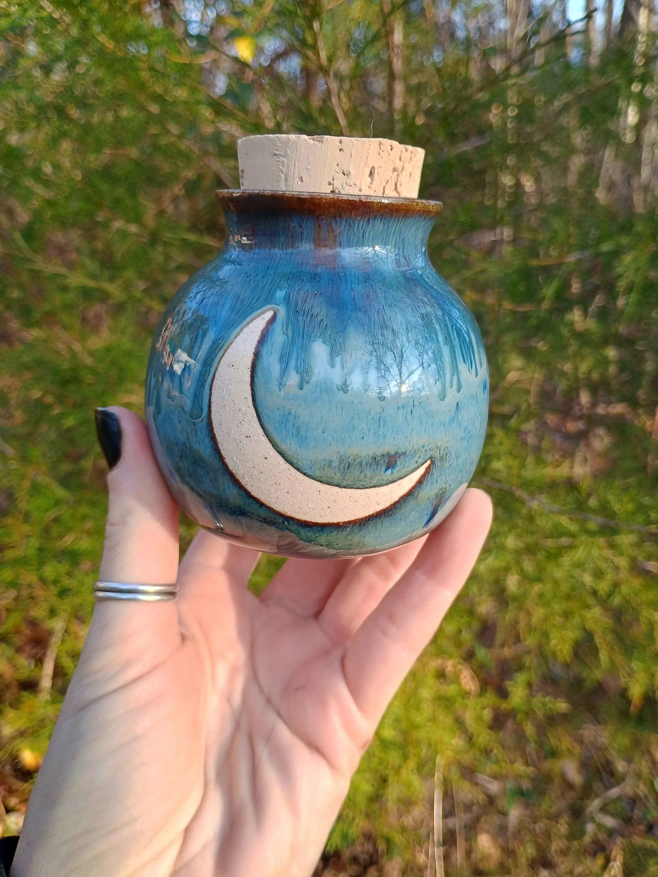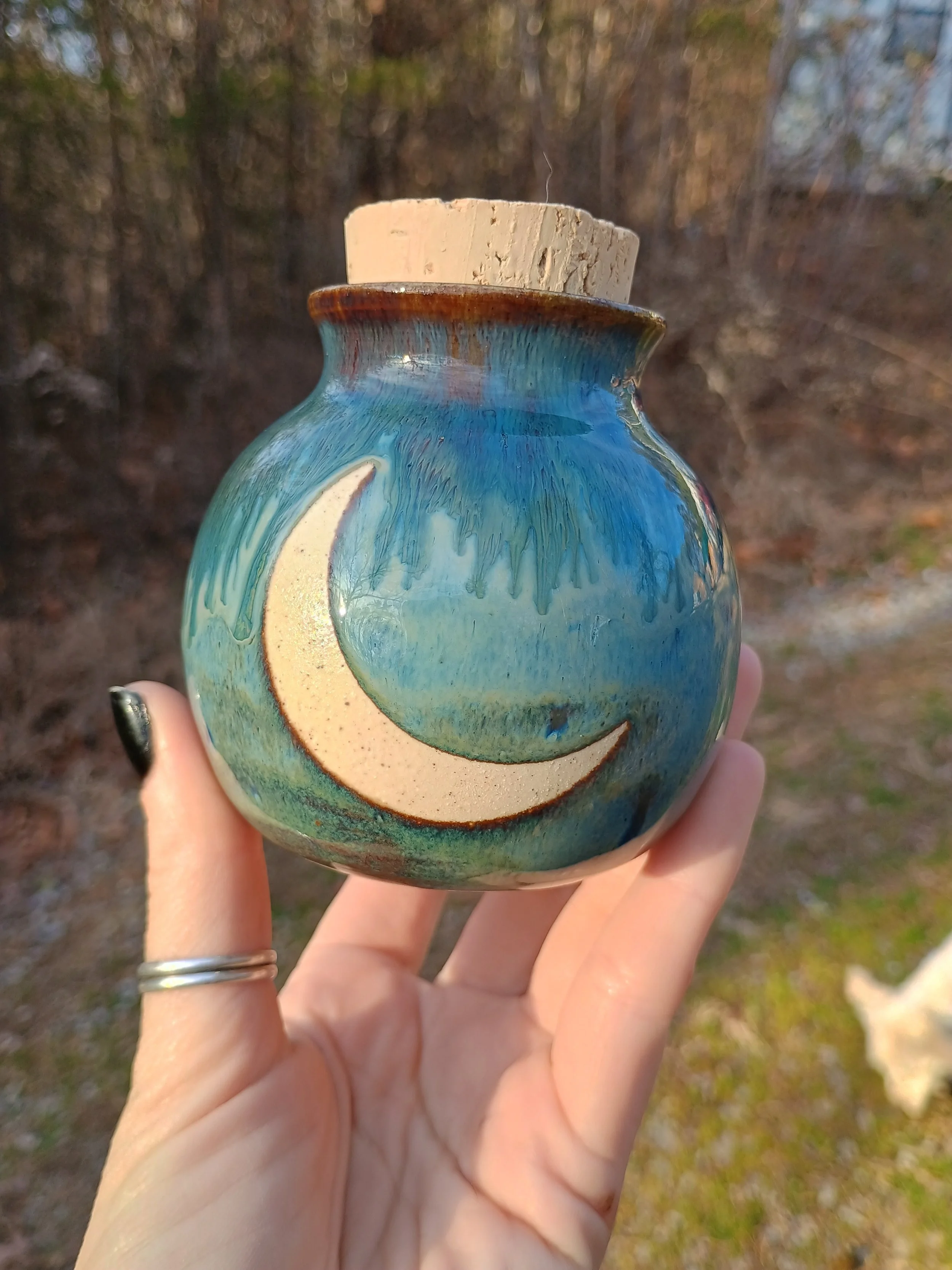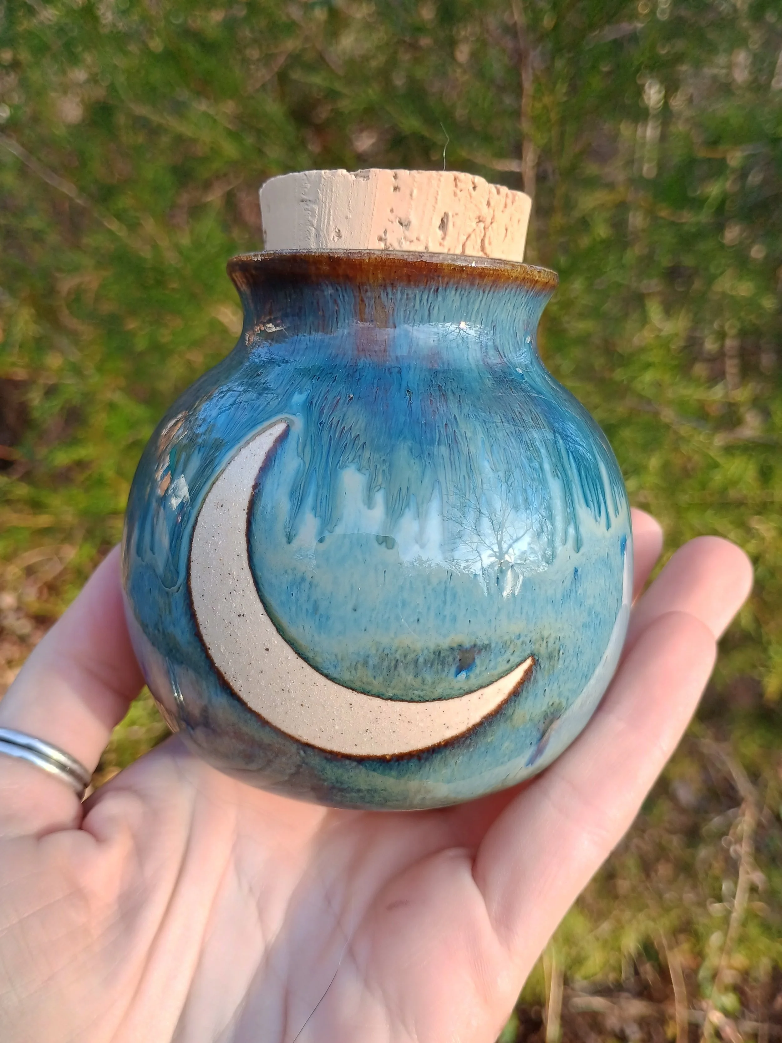 Shop › Round Crescent Moon Jar Image 1 of 5 Image 2 of 5 Image 3 of 5 Image 4 of 5 Image 5 of 5 Round Crescent Moon Jar $37.00 Glazed on the inside and food safe! ☺️ Add To Cart Added! Glazed on the inside and food safe! ☺️