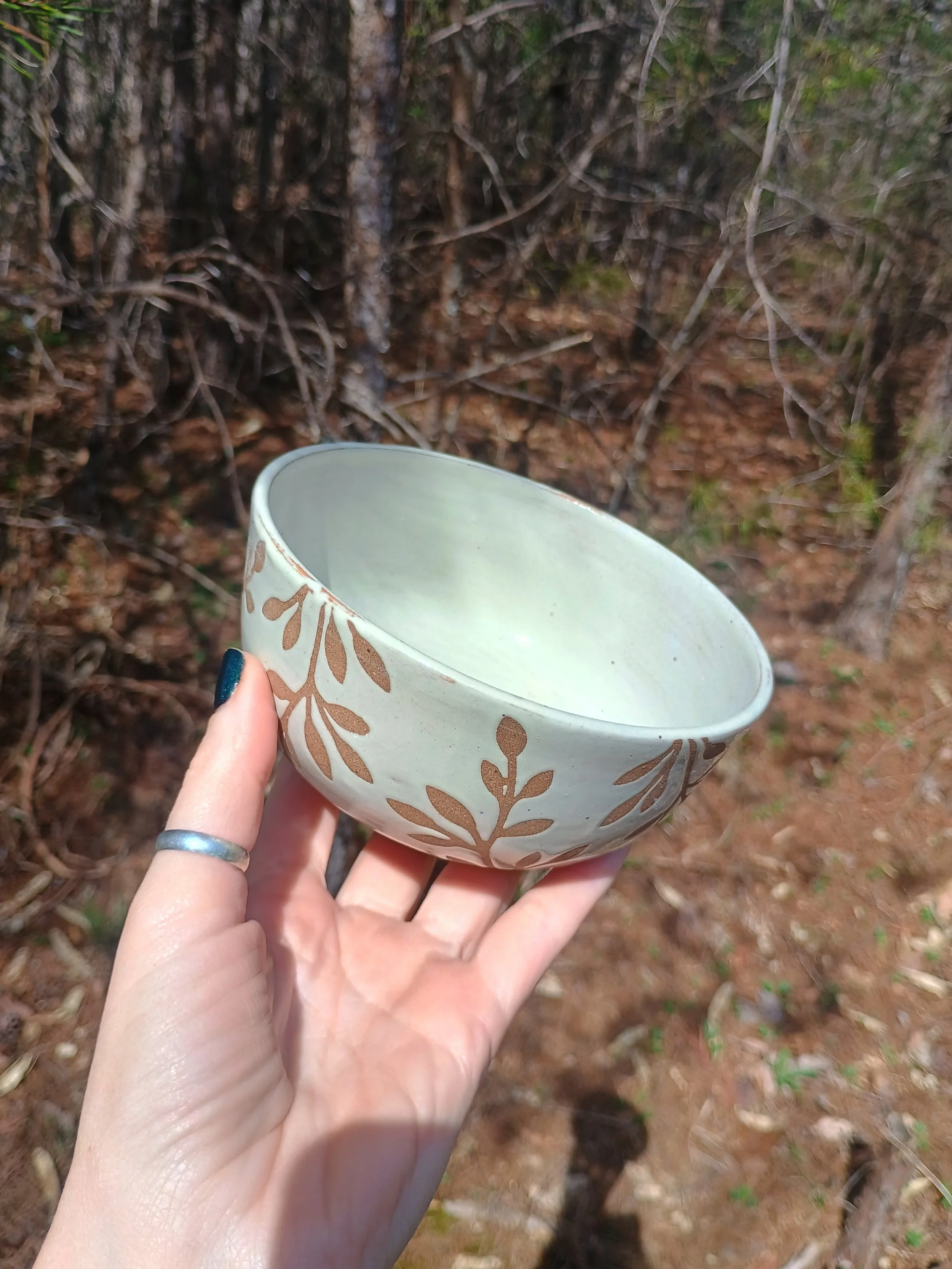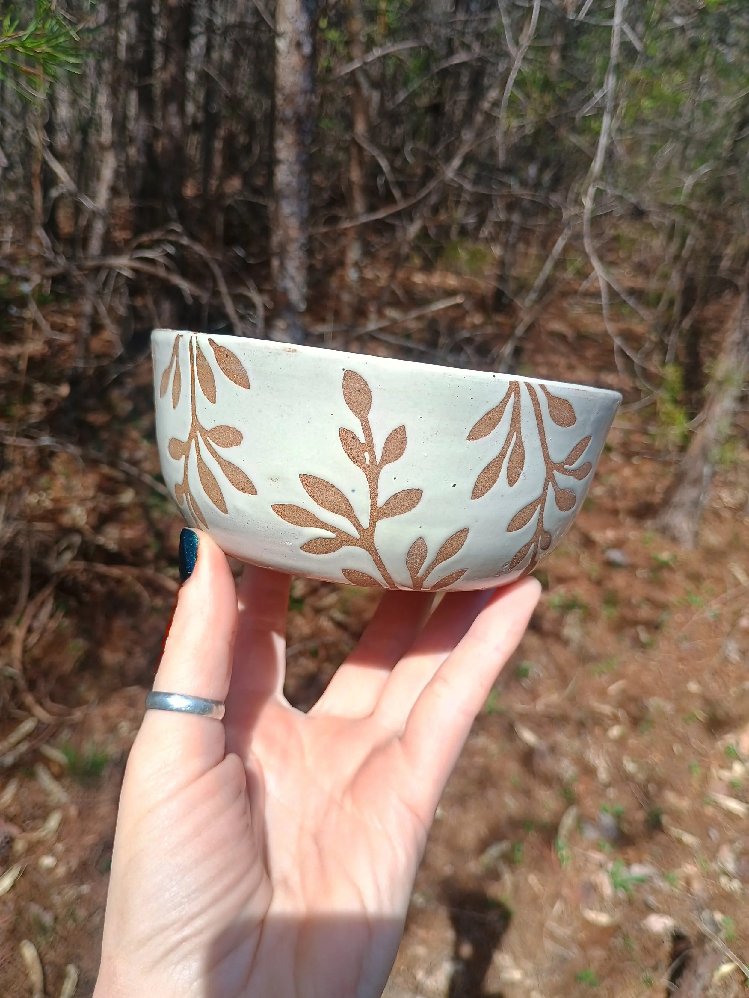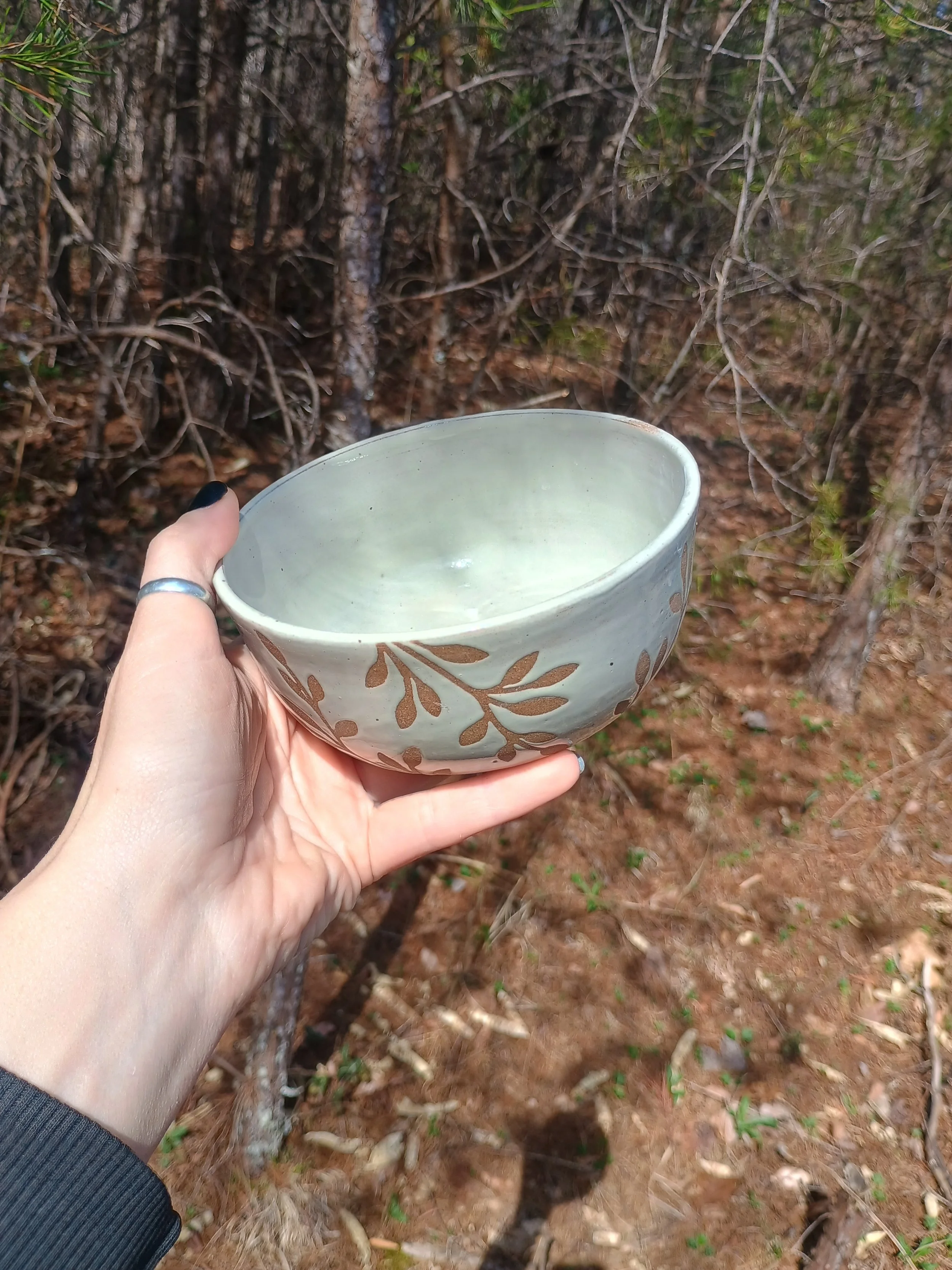 The cutest little bowl perfect for oatmeal, soup, a small salad, etc. With a rustic creamy glaze and all over leaf pattern that creates a lovely texture. Microwave and dishwasher safe but hand washing is strongly encouraged 💕