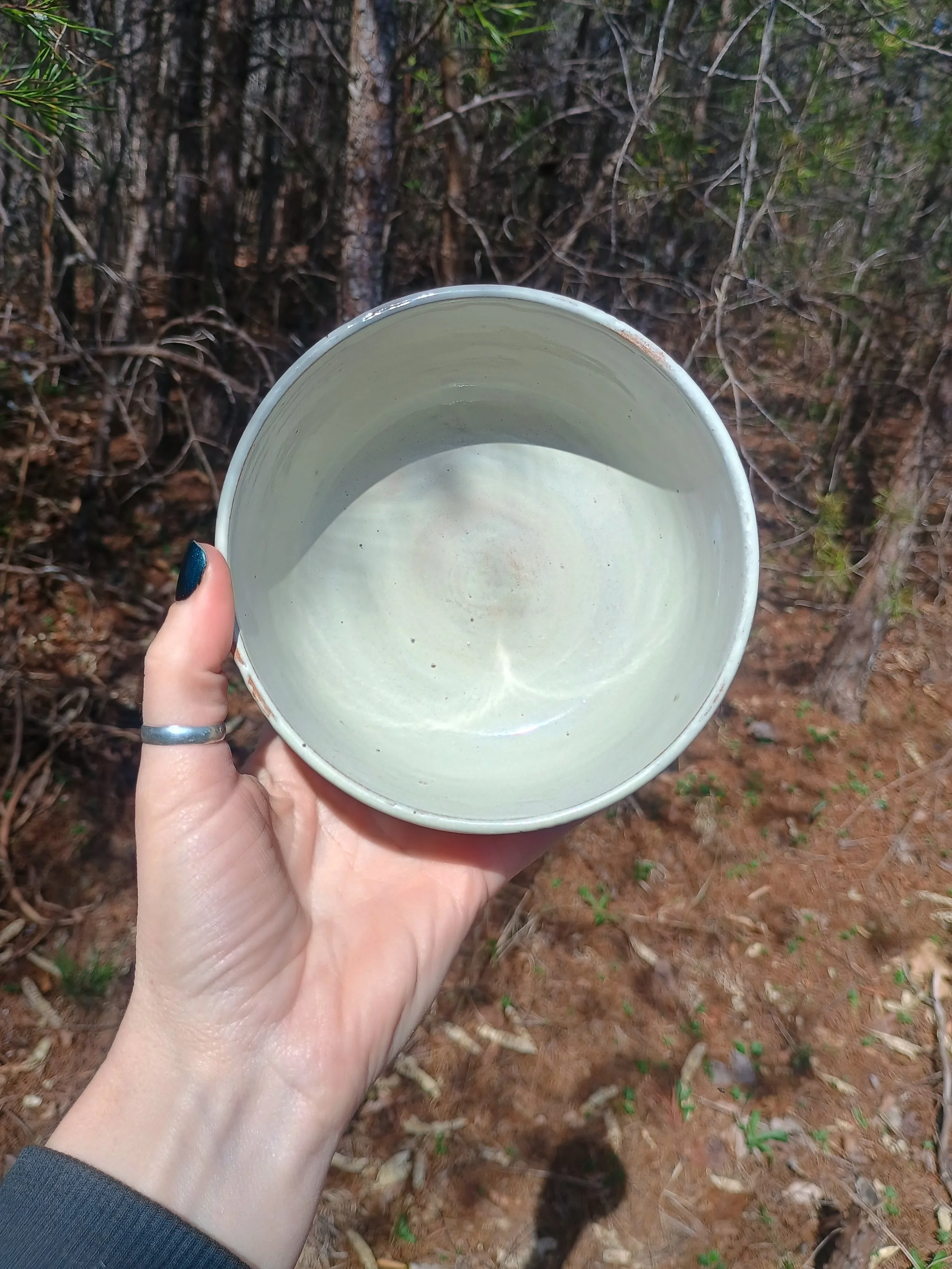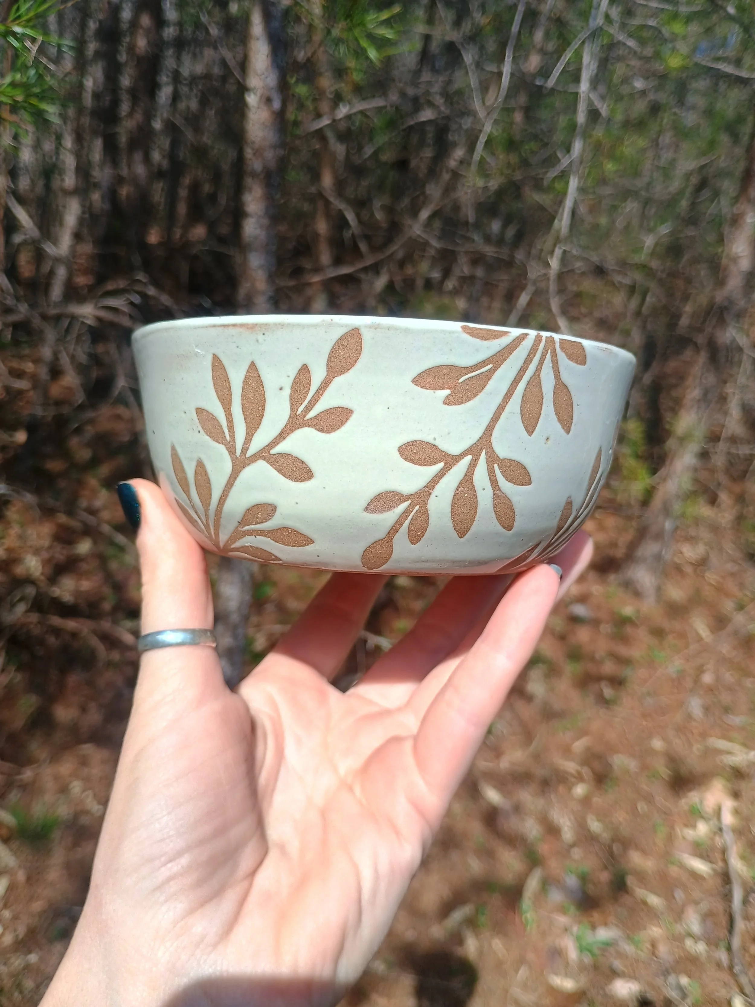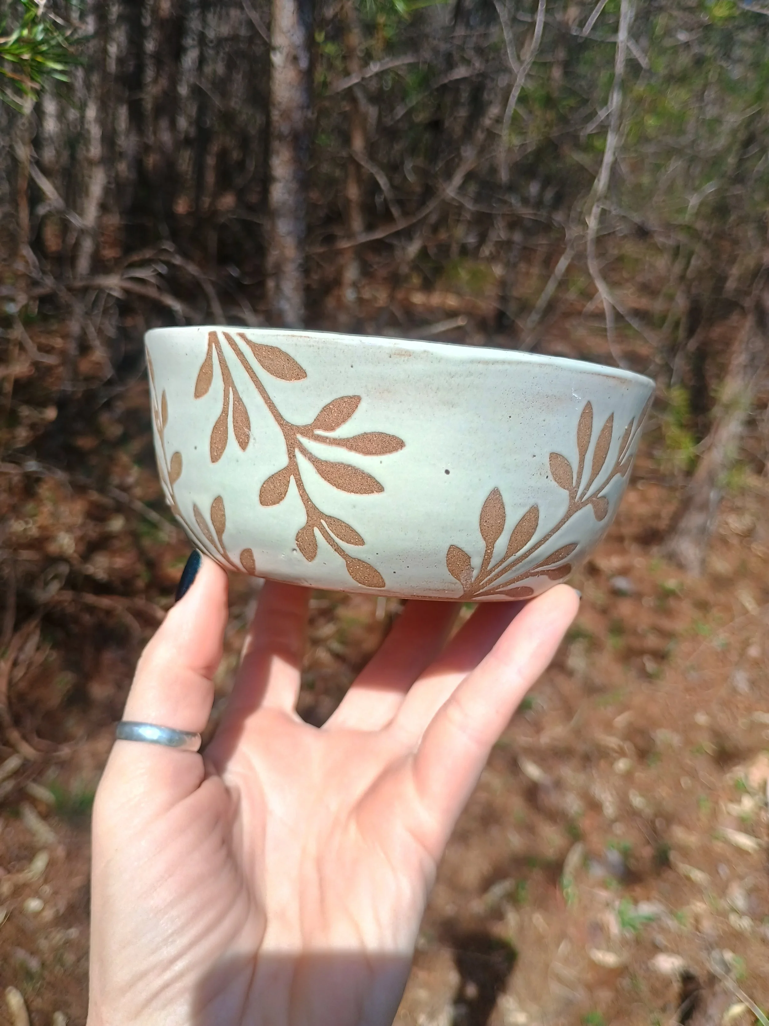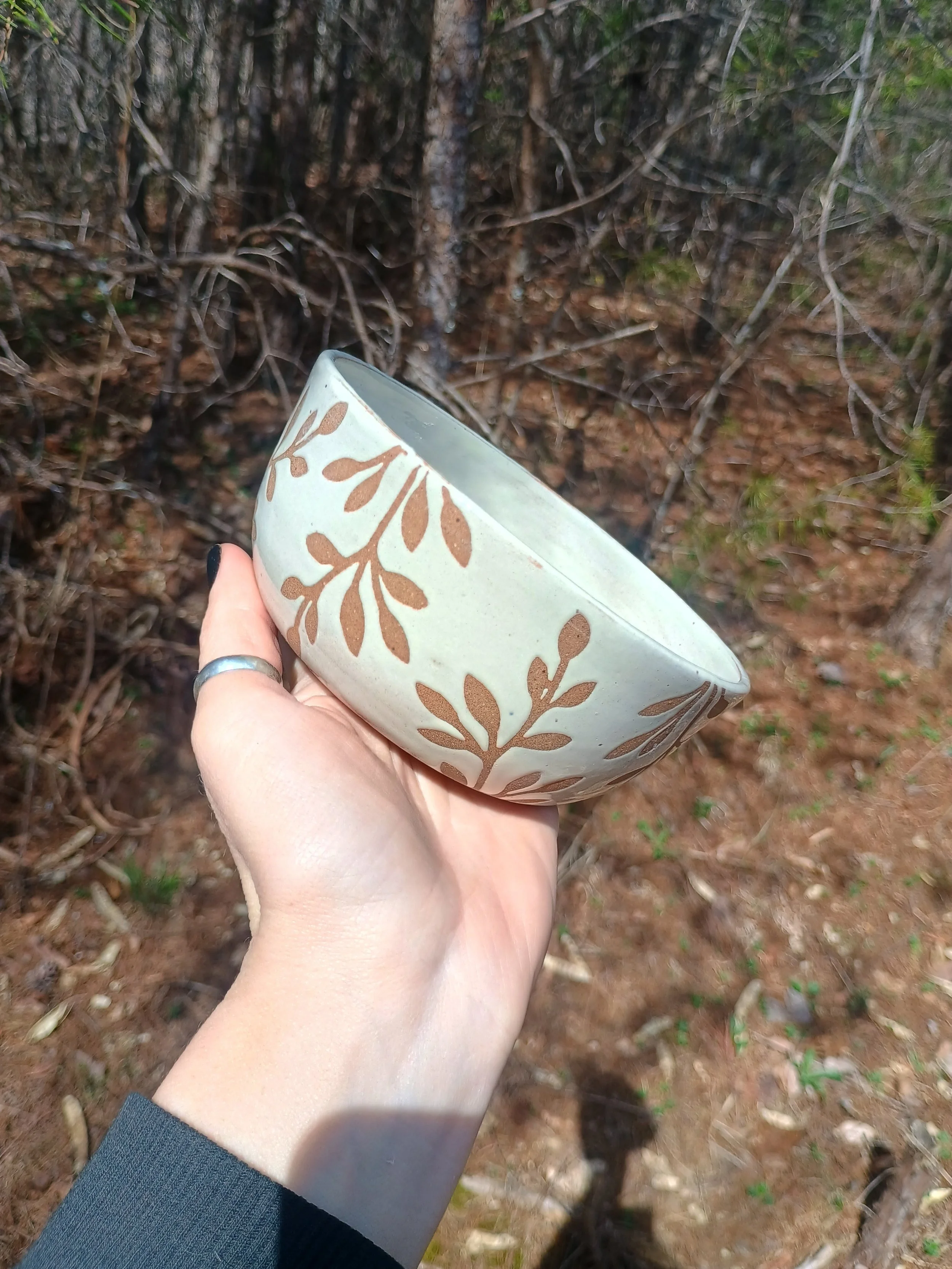 The cutest little bowl perfect for oatmeal, soup, a small salad, etc. With a rustic creamy glaze and all over leaf pattern that creates a lovely texture. Microwave and dishwasher safe but hand washing is strongly encouraged 💕