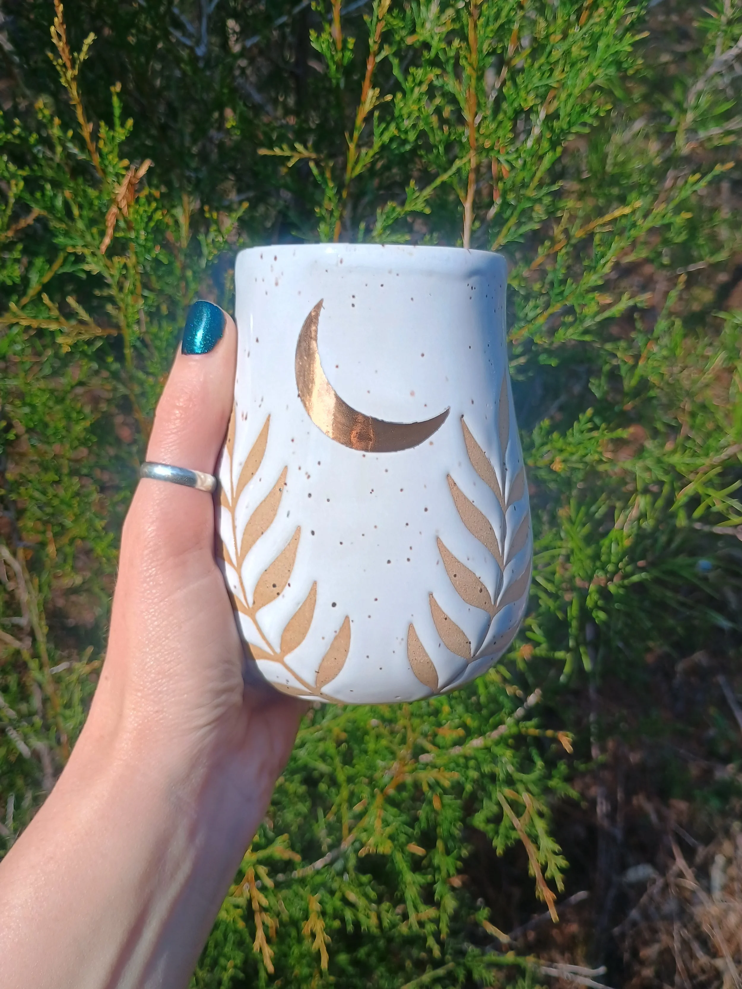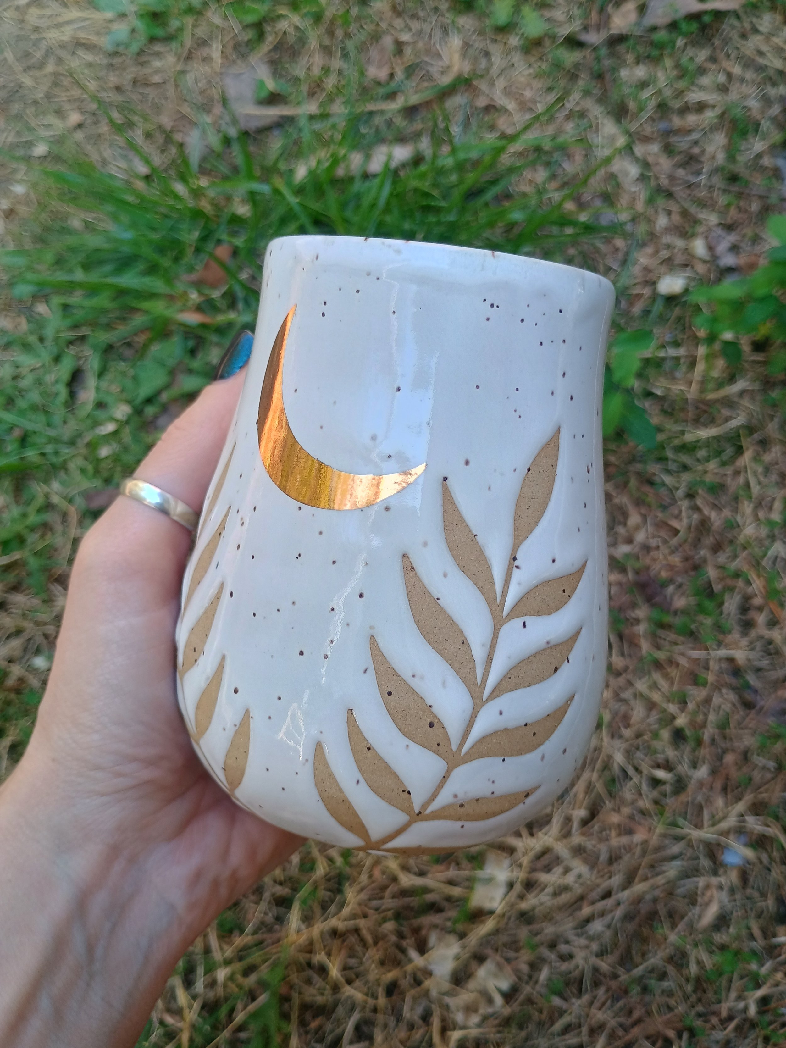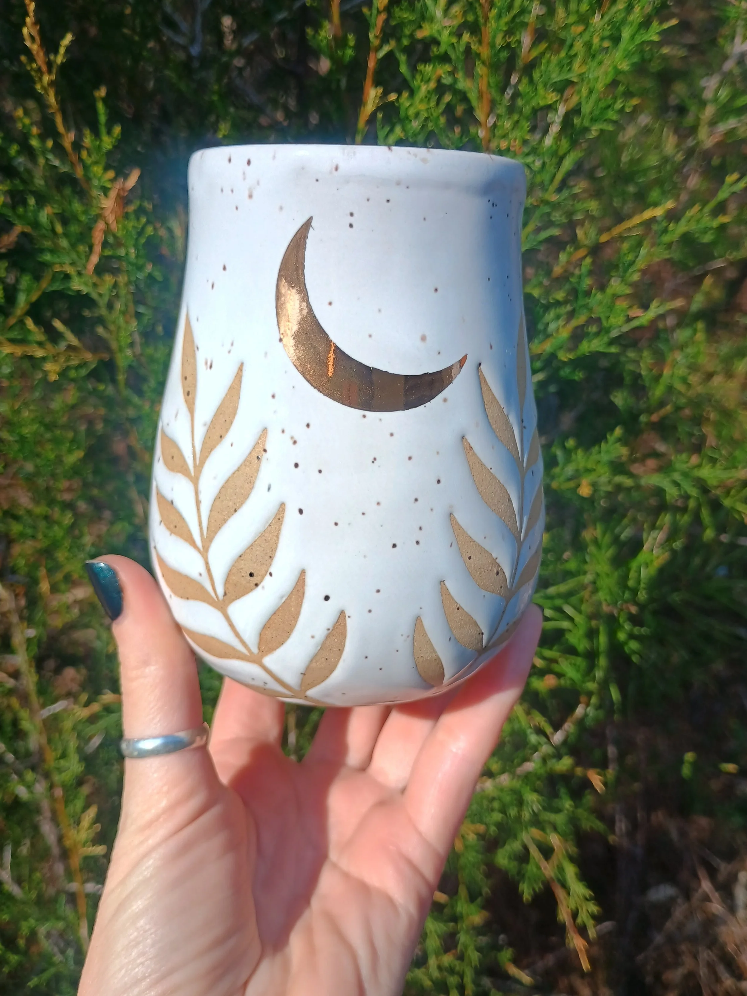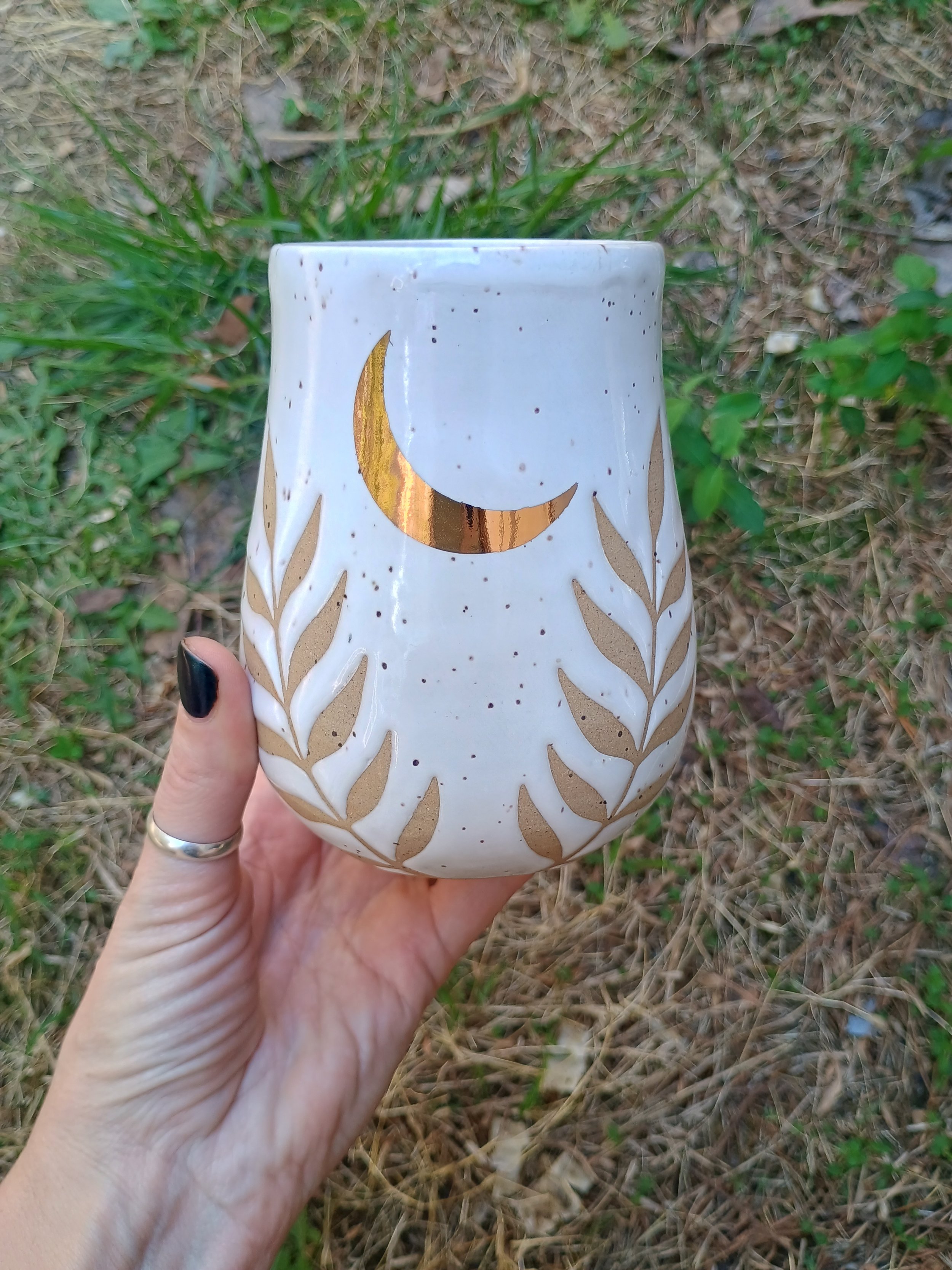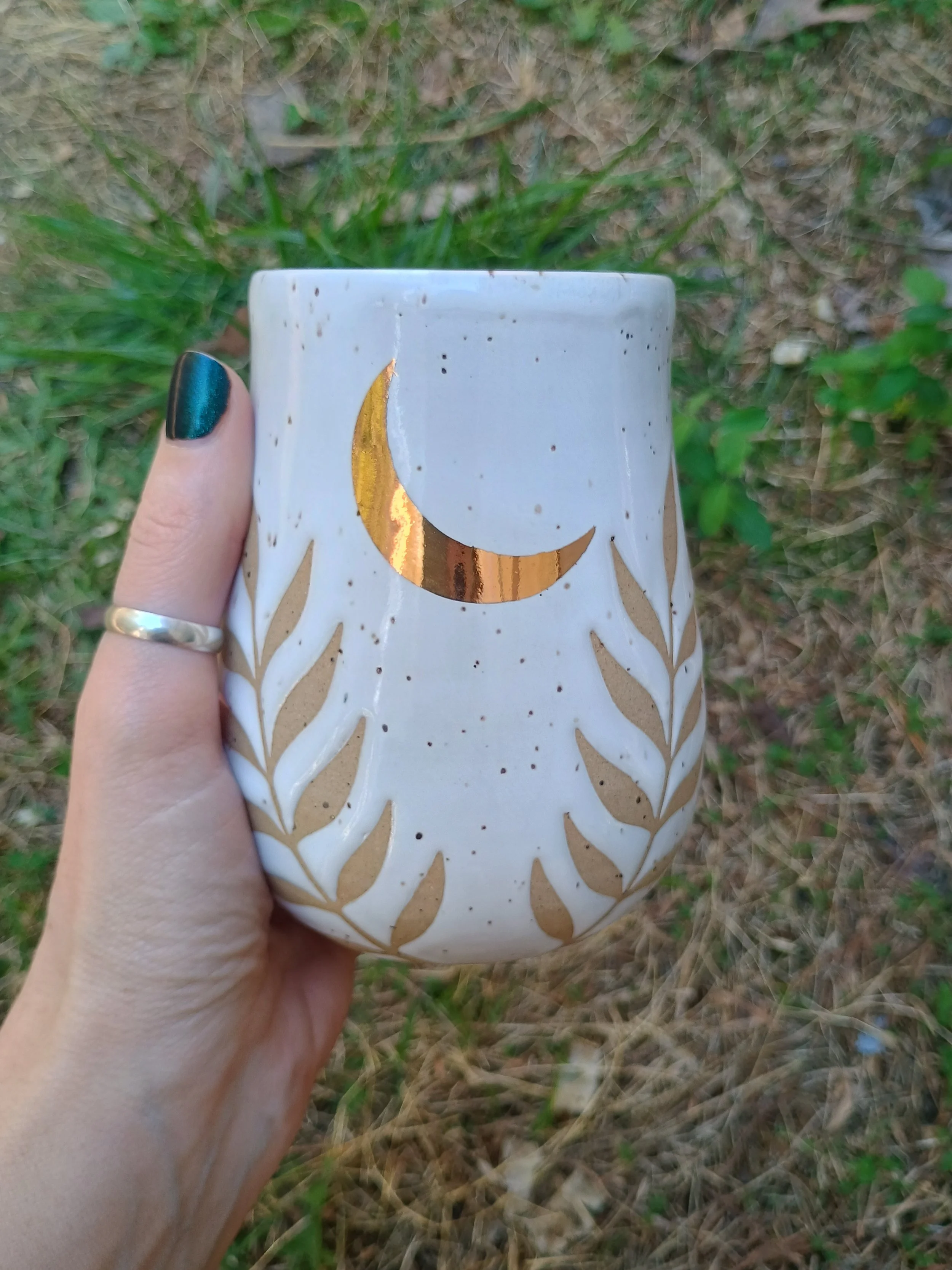 Shop › Gold Moon & Ferns Tumbler Image 1 of 6 Image 2 of 6 Image 3 of 6 Image 4 of 6 Image 5 of 6 Image 6 of 6 Gold Moon & Ferns Tumbler $60.00 This special tumbler is not microwave or dishwasher safe due to the real gold luster used for the moon. Hand wash gently 💕 Add To Cart Added! This special tumbler is not microwave or dishwasher safe due to the real gold luster used for the moon. Hand wash gently 💕